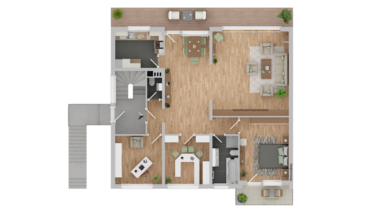 Über die leicht geschwungene Außentreppe gelangen Sie zum Eingang des Hauses.