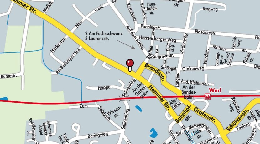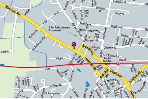Das Objekt liegt in zentrumsnaher Lage von Werl. In unmittelbarer Nähe befinden sich der Kurpark, das Schulzentrum, Ärzte und Einkaufsmöglichkeiten. Die Werler Fußgängerzone und der Bahnhof liegen ca. 800 m entfernt. Bis zur Anschlussstelle zur A445 sind es lediglich ca. 1,7 km.