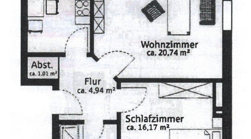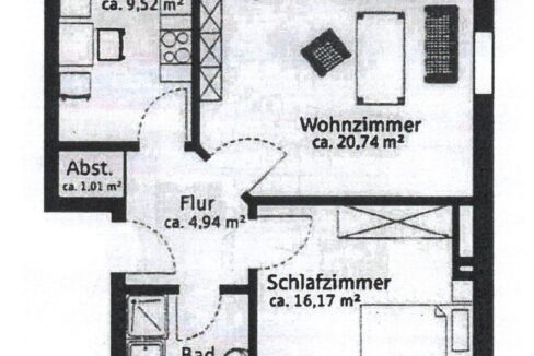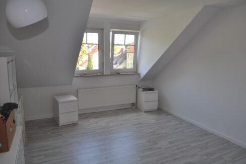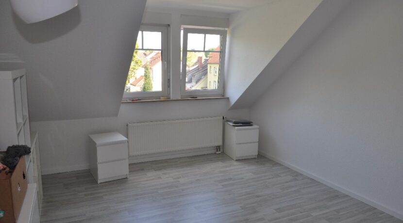 Die Wohnung liegt im Dachgeschoss eines Mehrfamilienhauses mit insgesamt 6 Wohneinheiten. Die ca. 60 m² Wohnfläche teilt sich auf in ein Wohnzimmer mit Zugang zu einer Loggia, ein Schlafzimmer, eine Küche, ein Tageslichtbad mit Dusche und Badewanne, einem Abstellraum und Flur. Die vorhandene Einbauküche wird mitvermietet. Ein Kellerraum und ein PKW-Stellplatz am Haus gehören ebenfalls mit zu der Wohnung.