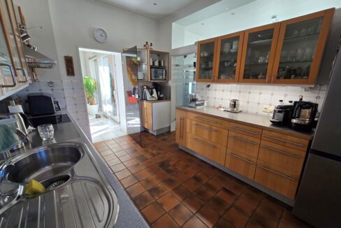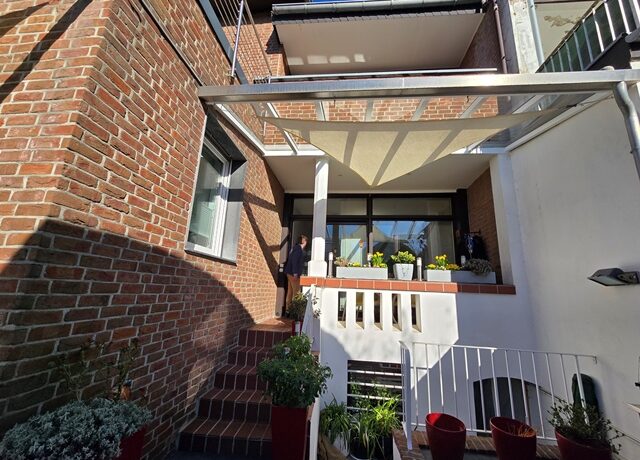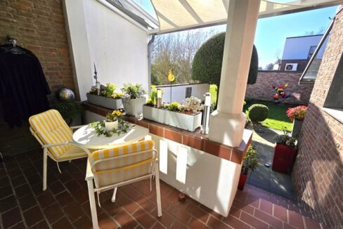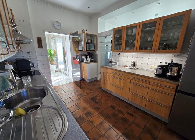 Erdgeschoss ca. 115m² Wohnfläche und 1 Garage. 4 Zimmer, große Küche, Bad mit Wanne und Bidet, vor ca.7 Jahren bodentiefe neue Dusche im Bad. Loggia und sehr große überdachte Terrasse und Garten. Holzdielen und PVC- Belag, Schlafzimmer mit Ankleide. Etwa 2/3 der Wohnfläche Fußbodenheizung. Gaszentralheizung. Eigener Kellerzugang auch von der Terrasse.