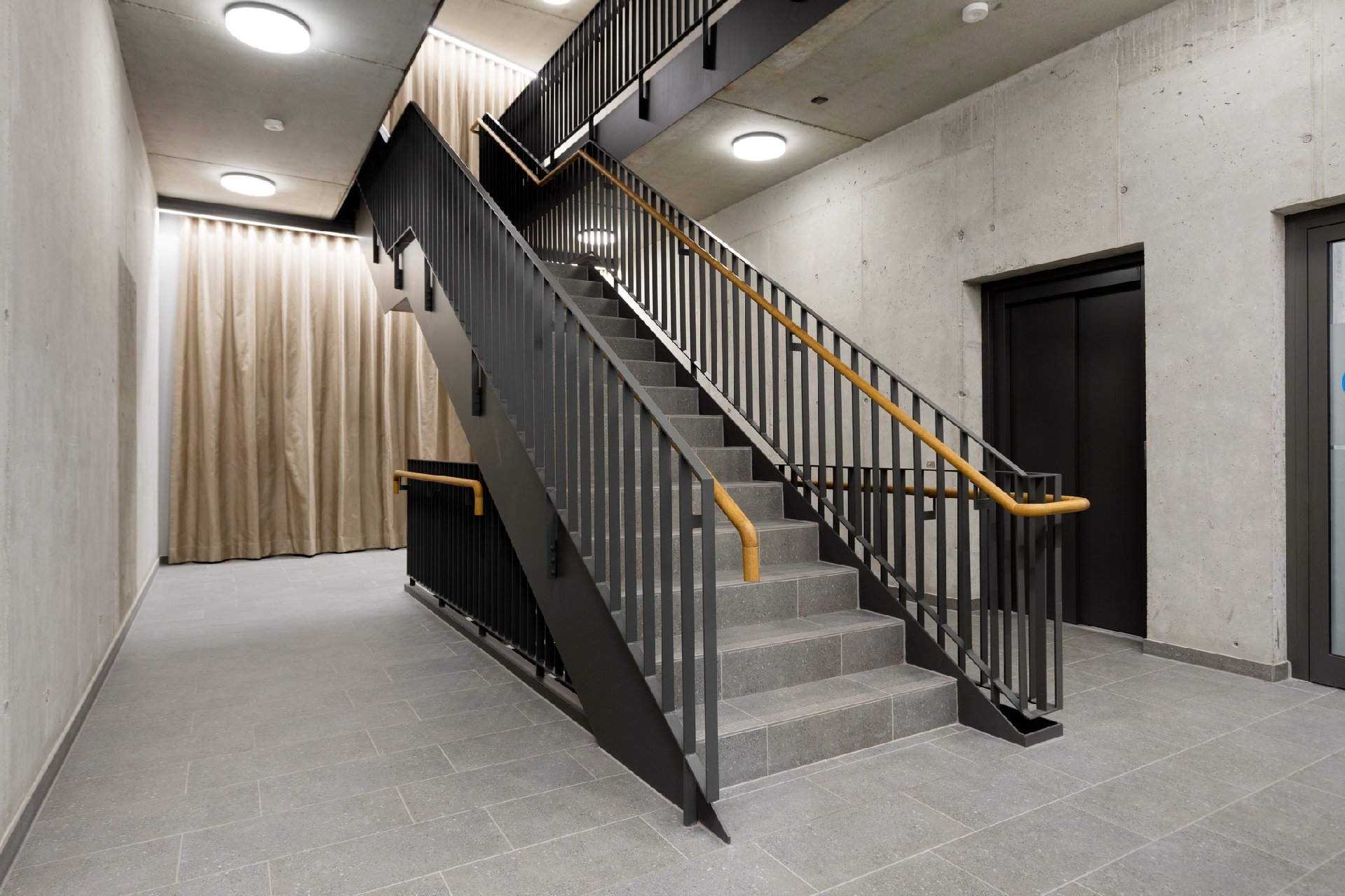 Die Wände werden in einer modernen Optik, ähnlich von Sichtbeton, übergeben, was den Räumlichkeiten einen zeitgemäßen und industriellen Charme verleiht.