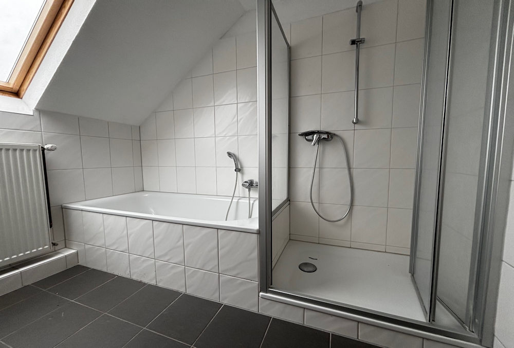 - Badausstattung: Dusche, Badewanne, Fenster im Badezimmer