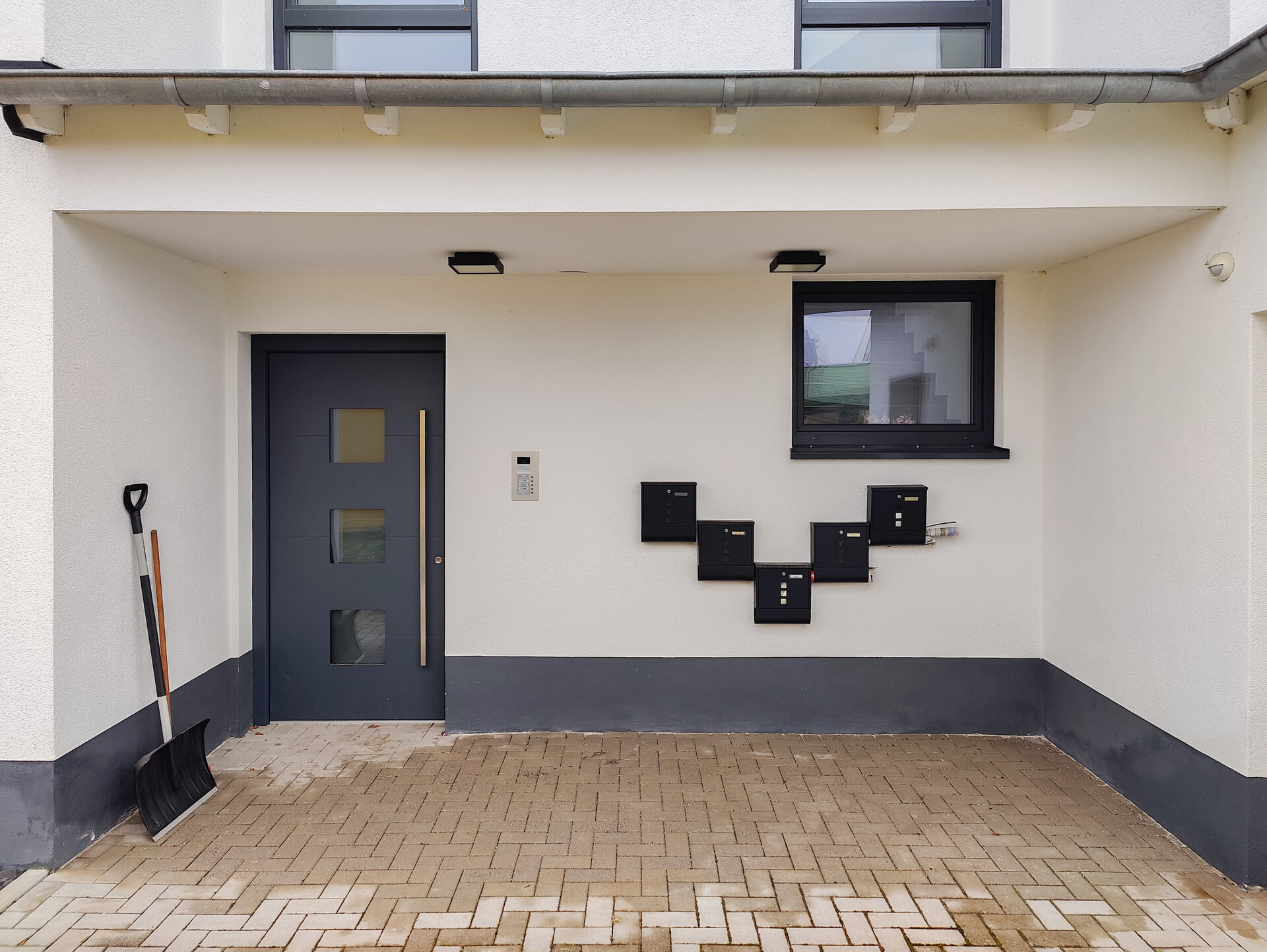 Im Bereich der Eingangstür befindet sich eine moderne Türsprechanlage mit Kamera.