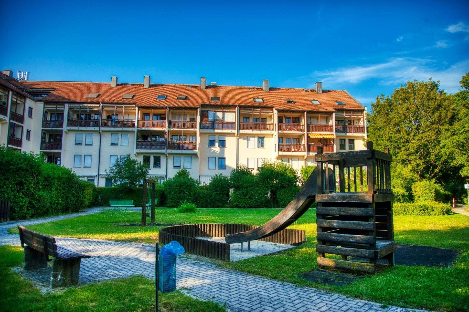 Direkt neben der Wohnanlage befindet sich der Rolf-Zeitler-Park, die größte zusammenhängende Grünanlage Unterschleißheims. Sie bietet weitläufige Spazier- und Radwege, großzügige Wiesenflächen sowie Spiel- und Freizeitmöglichkeiten für jedes Alter. Ganz in der nähe auch das örtliche Sportstadion, Tennisplätze sowie die Schwimmhalle.