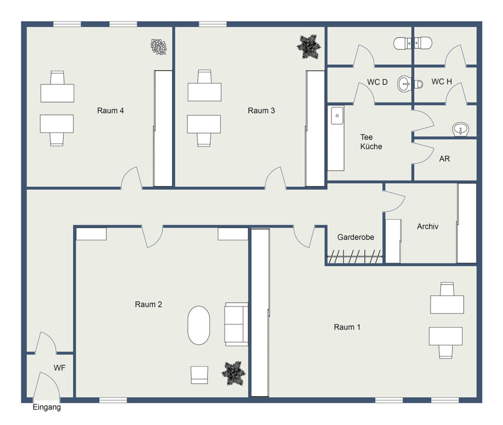 Getrennte WCs Damen/Herren, Abstellraum und einen Archivraum sowie Garderobendiele.