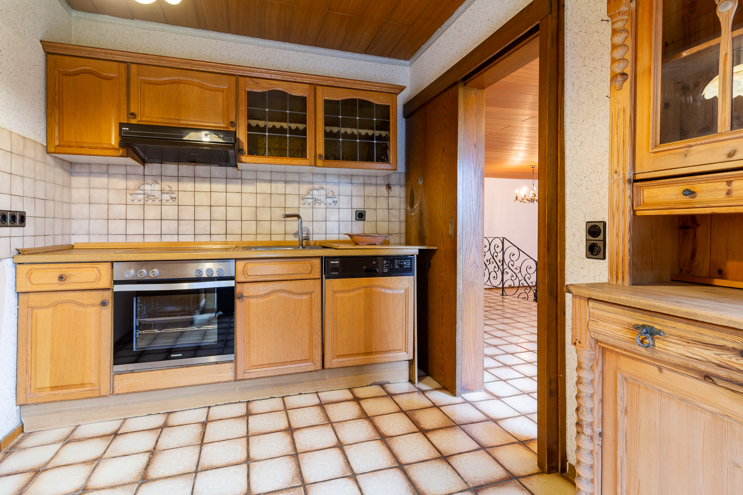 Von der Diele aus eröffnet sich das Herzstück des Hauses, das großzügige Wohn-/Esszimmer, welches sich über zwei Etagen erstreckt. Dank der großen Fensterfront kommt viel Licht herein und ebenso eröffnet sich der Blick ins Grüne. Über den Essbereich gelangen Sie in Ihre Küche, von ihr geht eine kleine, separate Terrasse ab, die sich perfekt für den morgendlichen Kaffee oder eine ruhige Pause zwischendurch anbietet. Durch die vorhandene Raumaufteilung bietet sich die Umgestaltung der Küche zu einer offenen Wohnküche an, sodass Kochen, Essen und Wohnen künftig nahtlos ineinander übergehen können und ein moderner Lebensmittelpunkt entsteht.