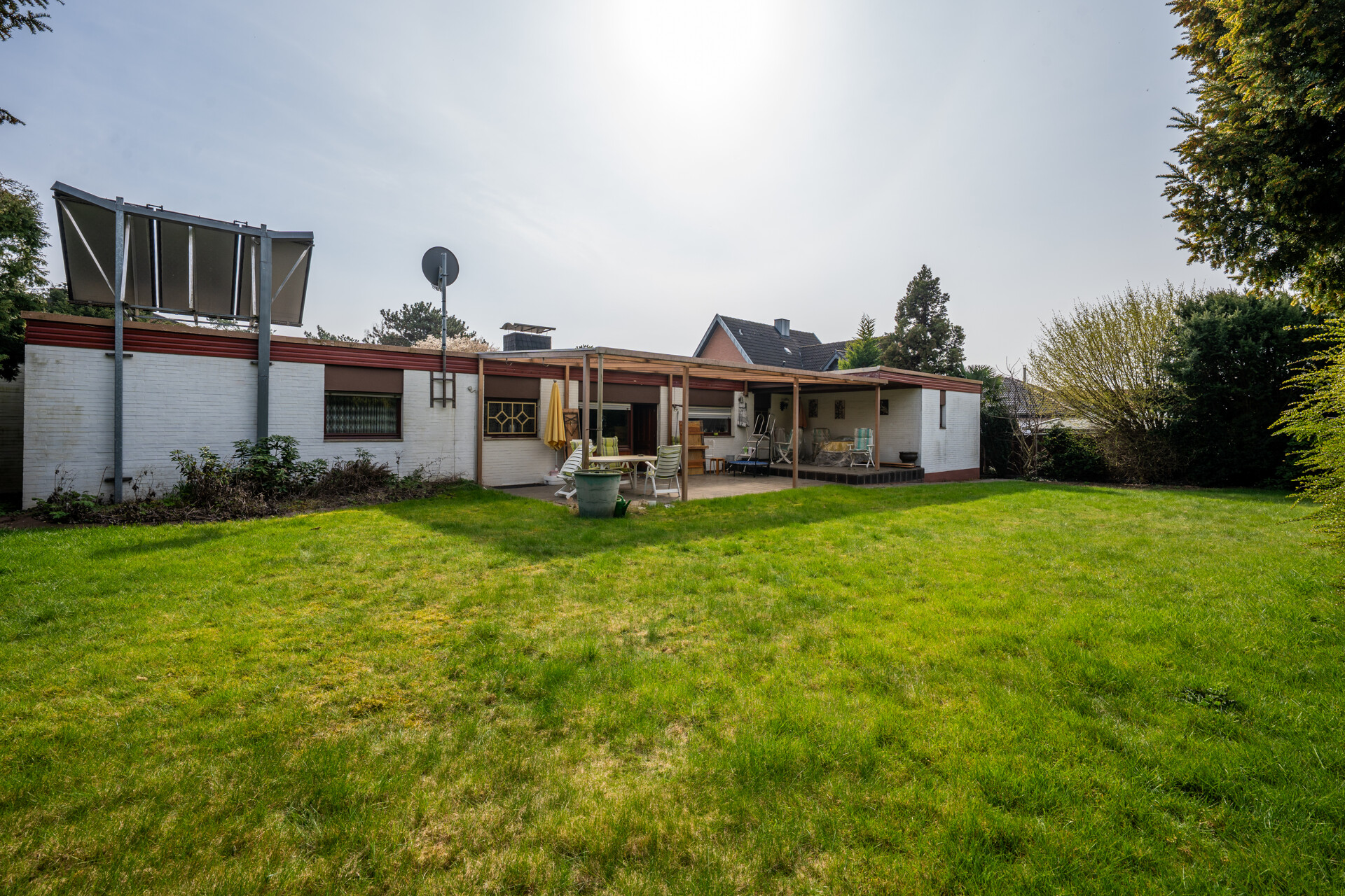 Dieser großzügige Bungalow aus dem Baujahr 1963 bietet auf ca. 160 m² Wohnfläche komfortables Wohnen auf einer Ebene und überzeugt durch eine durchdachte Raumaufteilung. Der helle Wohn- und Essbereich mit Zugang zur Terrasse sowie mehrere flexibel nutzbare Zimmer schaffen ideale Voraussetzungen für Familien oder Paare mit Platzbedarf. Das Haus ist voll unterkellert und verfügt über zusätzliche Nutzflächen welche nicht in der Wohnfläche enthalten sind, darunter ein Partyraum, Sauna mit Dusche, separates WC sowie ein weiterer Raum, der sich als Gästezimmer, Homeoffice oder Kinderbereich eignet. Die integrierte Garage ermöglicht einen direkten Zugang ins Haus. Das weitläufige Grundstück mit 1.484 m² bietet viel Platz zur individuellen Gestaltung und rundet dieses attraktive Angebot ab.