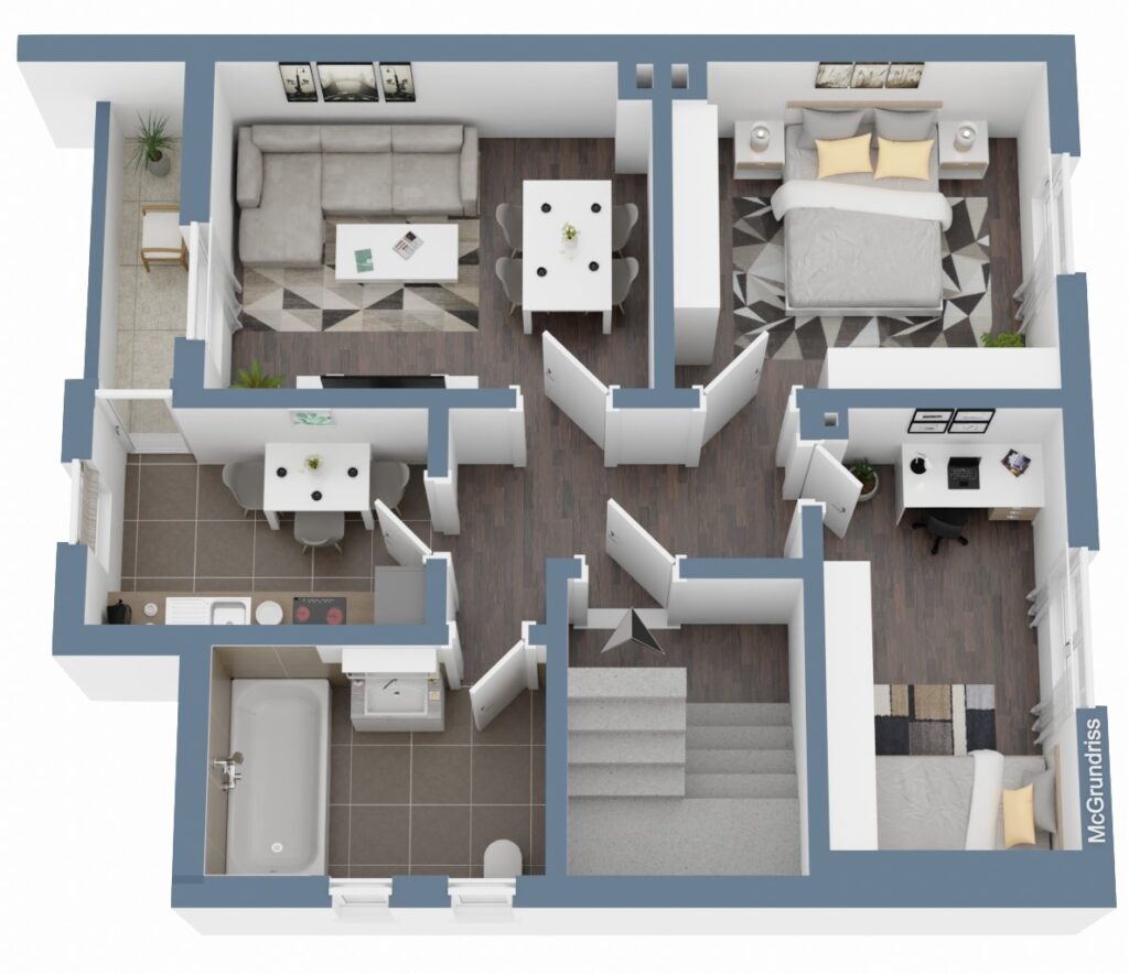 Alle Wohnungen verfügen über Tageslichtbäder, im Erd-/ und Obergeschoss jeweils mit Badewanne, im Dachgeschoss mit Dusche.