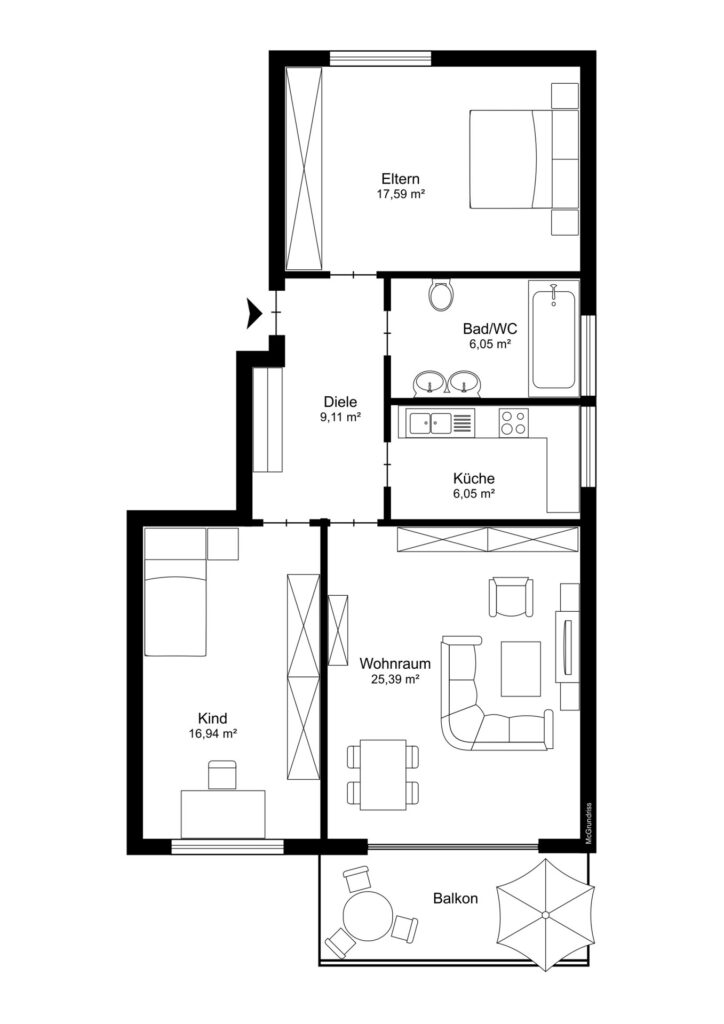 Die angrenzende Küche bietet ausreichend Platz zum Kochen und schließt direkt an den großzügigen, lichtdurchfluteten Wohn- und Essbereich an. Von hier aus gelangen Sie auf den geräumigen, gepflegten Balkon. Ideal für sonnige Stunden im Freien. Ein weiteres Zimmer, das sich direkt an den Wohnbereich anschließt, eignet sich hervorragend als Kinderzimmer, Büro oder Gästezimmer.