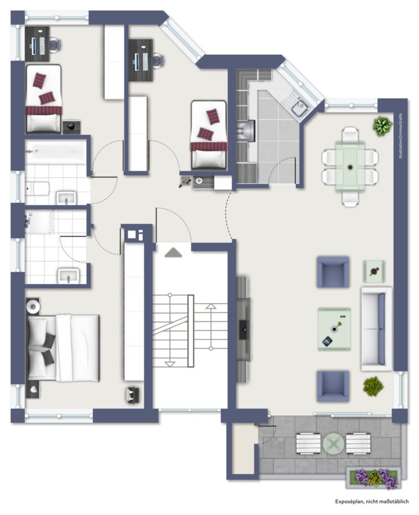 Der Grundriss überzeugt durch einen hellen Wohn- und Essbereich mit Zugang zum sonnigen Südbalkon. Dank Markise genießen Sie hier entspannte Stunden im Freien. Die separate Küche, eine großzügige Diele sowie drei weitere Zimmer bieten ausreichend Platz für z.B. Elternschlafzimmer, Kinderzimmer und ein Homeoffice oder Gästezimmer.