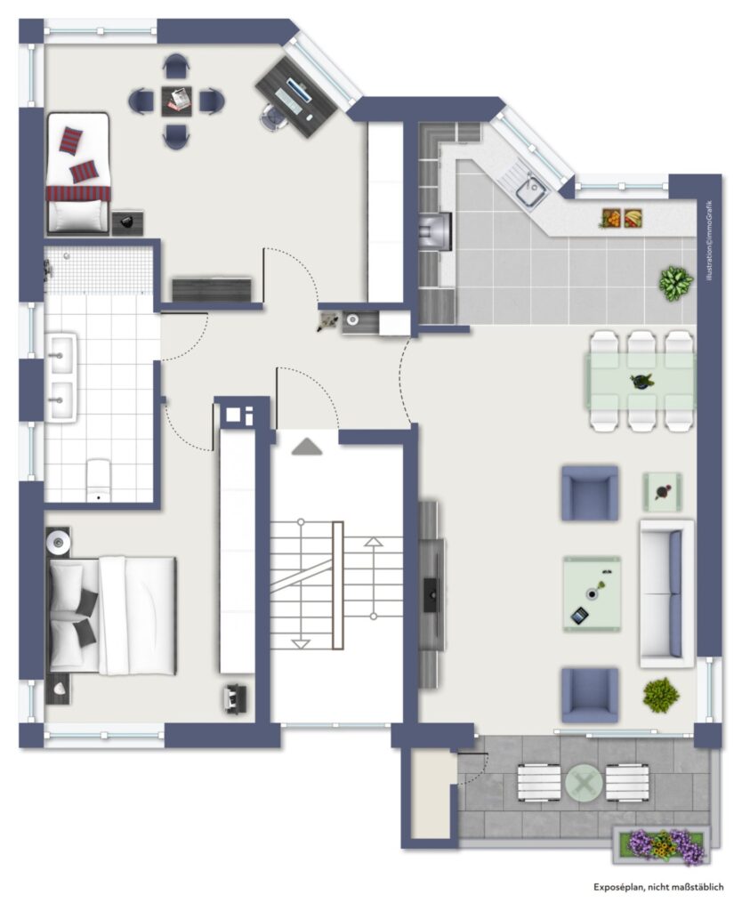 Die genaue Aufteilung entnehmen Sie bitte dem beigefügtem Grundriss.