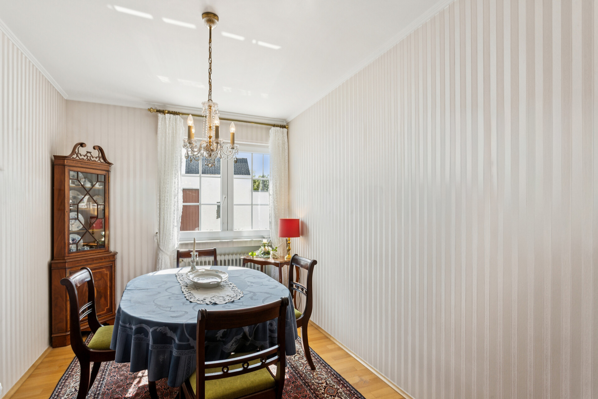 Die geräumige Küche bietet Platz für entspannte Kochabende. Da sie genügend Platz für einen Esstisch bietet, kann das aktuelle Esszimmer problemlos anderweitig genutzt werden. Gegenüber des aktuellen Esszimmers befindet sich das Gäste-WC und gegenüber vom Schlafzimmer das Badezimmer mit Badewanne. Beide Bäder verfügen über ein Tageslichtfenster.