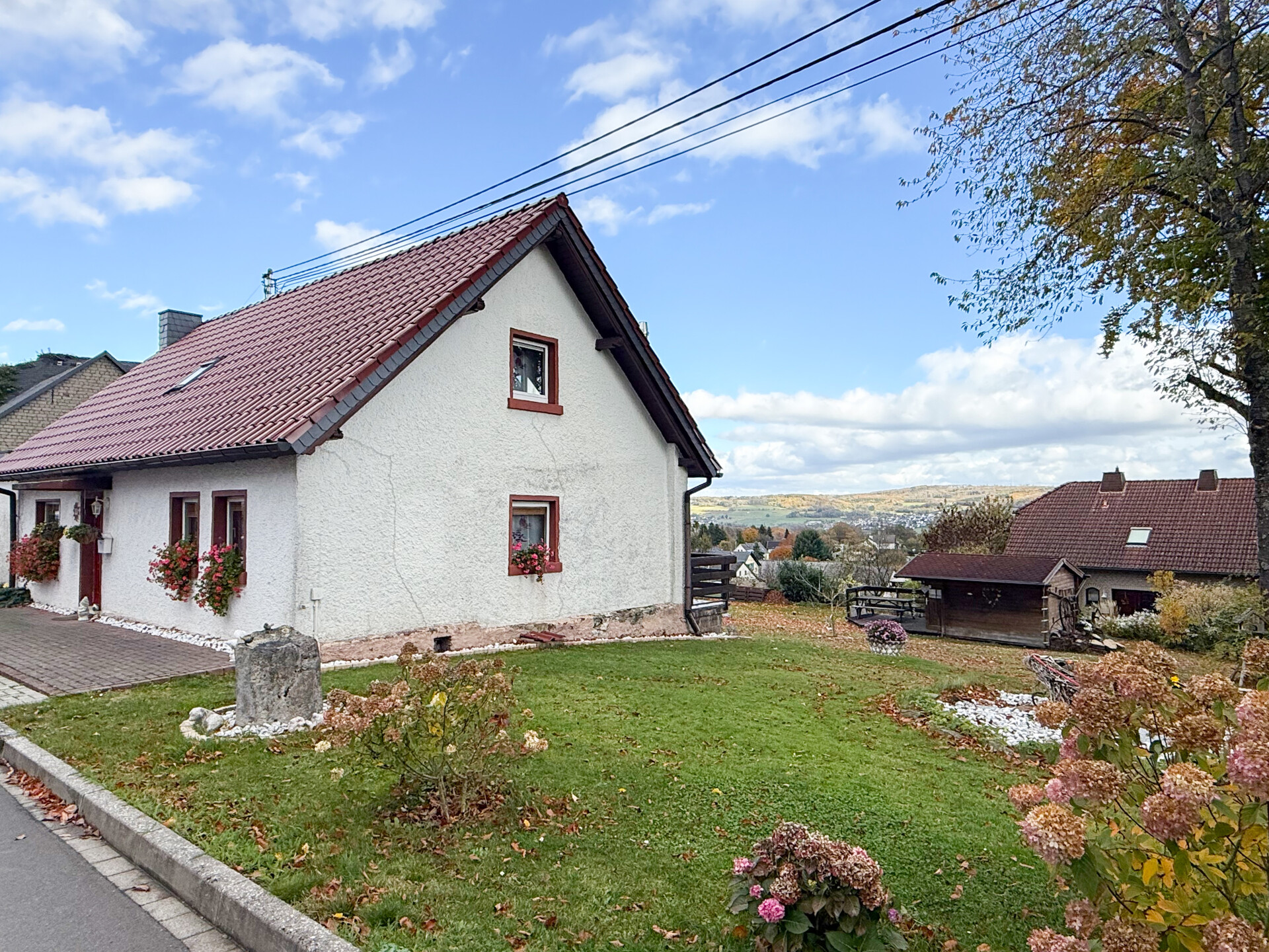Dieses charmante Einfamilienhaus aus ca. 1914 befindet sich in herrlicher Höhenlage auf einem großzügigen Grundstück von rund 1.219 m², das sich bei Bedarf auch in einen separaten Bauplatz aufteilen ließe. Das Haus präsentiert sich gepflegt und bietet eine Wohnfläche von etwa 110 m², die sich über Erd- und Dachgeschoss erstreckt. Im Erdgeschoss empfängt Sie ein großer Wohnbereich mit Kaminofen, von dem aus Sie sowohl den Balkon als auch den Garten erreichen. Das Esszimmer liegt direkt neben der Küche, welche ebenfalls über einen Zugang zum Balkon verfügt. Ein helles Tageslichtbad mit Wanne und Dusche sowie ein weiteres Zimmer, vervollständigen diese Ebene. Die Raumaufteilung ermöglicht komfortables Wohnen auf einer Ebene und eignet sich damit auch hervorragend für das Wohnen im Alter. Im Dachgeschoss stehen zwei Schlafzimmer und ein kleiner Raum, der sich als Büro oder Abstellfläche eignet, zur Verfügung. Der Spitzboden bietet zusätzlichen Stauraum. Eine Einzelgarage mit elektrischem Tor sowie ein Kriechkellerraum sind ebenfalls vorhanden. Das gepflegte Grundstück mit Baumbestand, Gartenhäuschen und beeindruckendem Fernblick macht dieses Zuhause besonders attraktiv. Der Ort selbst besitzt eine eigene Kindertagesstätte und eine Grundschule – ideal für Familien.