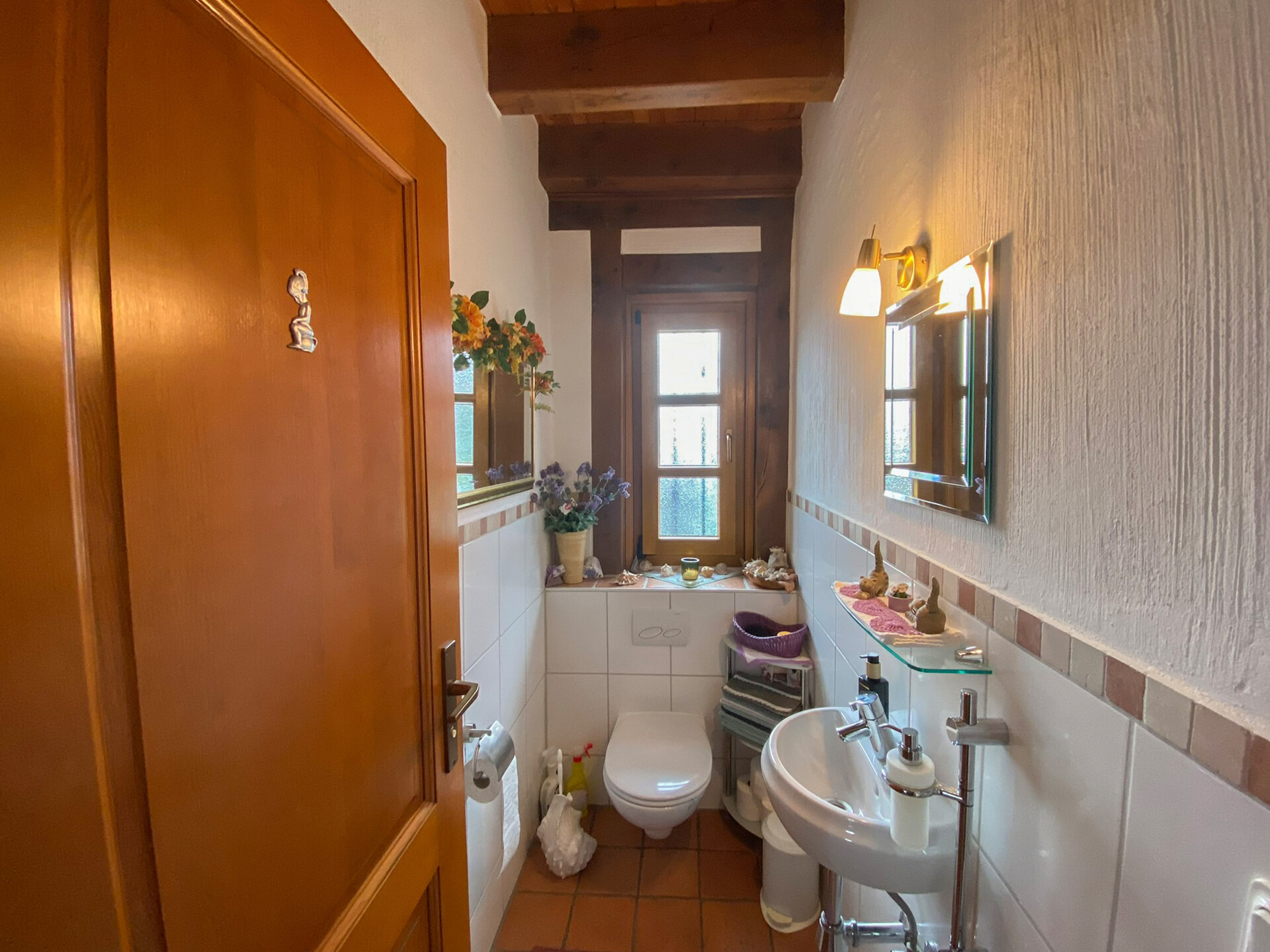 Im Obergeschoss befinden sich zwei Schlafzimmer, ein Badezimmer mit Fußbodenheizung sowie ein weiteres Gäste-WC. Ein zusätzlicher, kleiner Raum bietet sich hervorragend als Bügelzimmer oder individueller Arbeitsbereich an. Abgerundet wird das Obergeschoss durch einen ansprechenden Parkettboden.