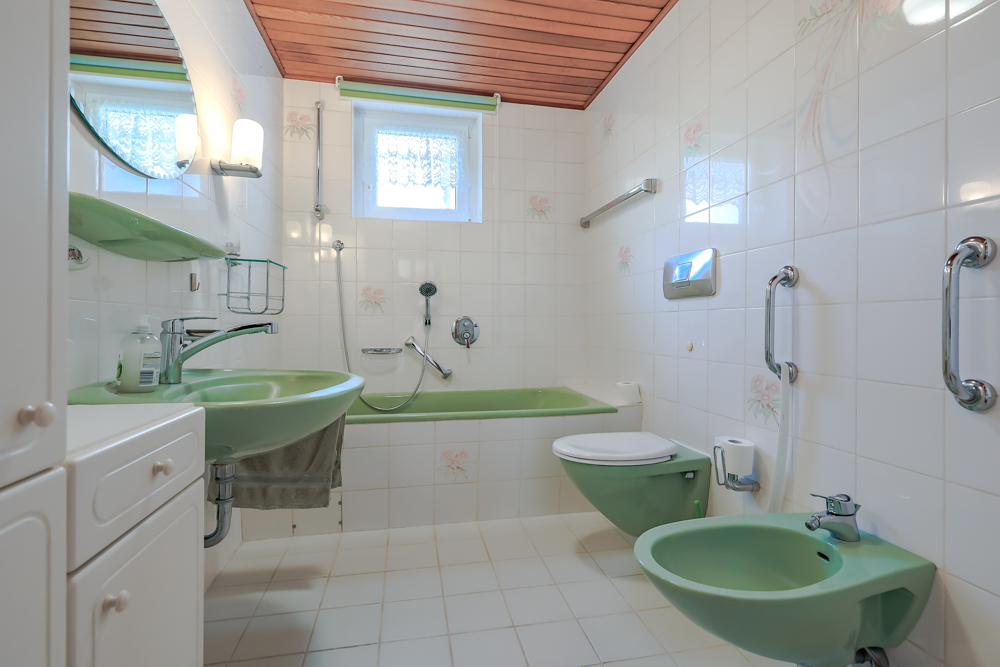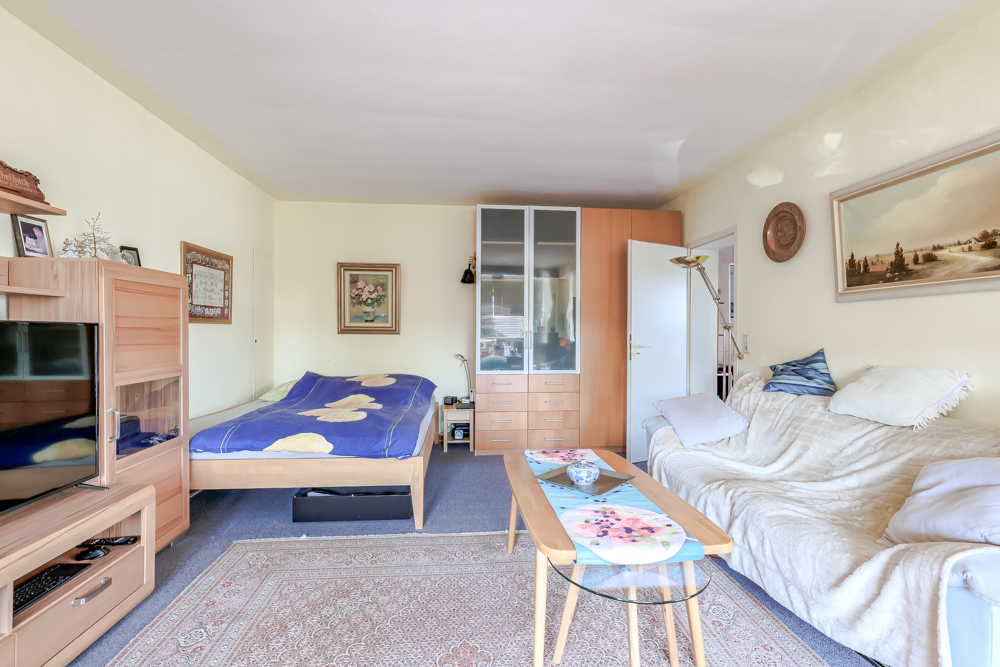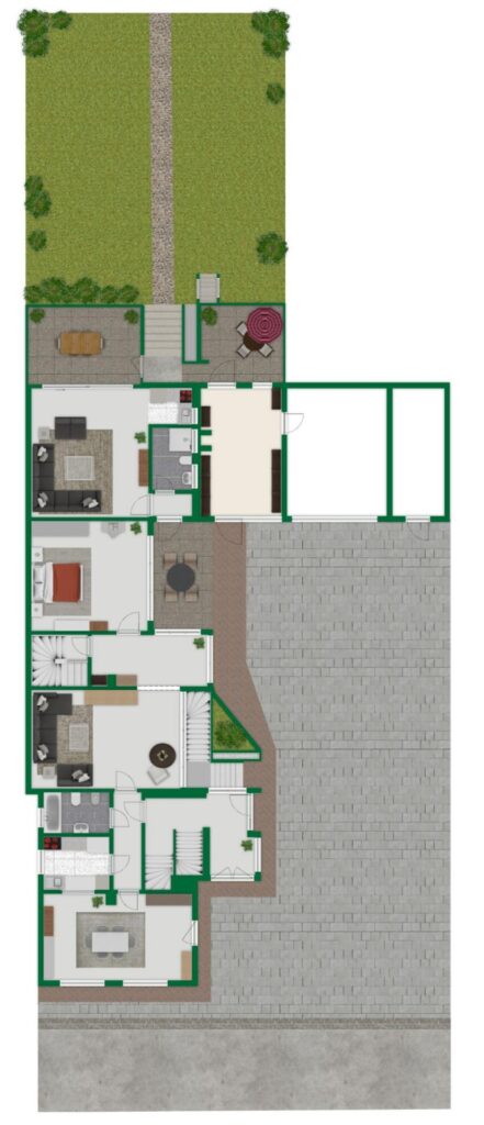 Zusätzlich gibt es im Erdgeschoss noch einen in Wohnraumqualität ausgebauten Raum mit einem Badezimmer und angeschlossener Terrasse.