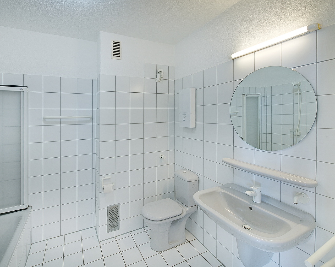 Wannenbad und Gäste-WC sind innenliegend und weiß gefliest. Bügelbrett und Staubsauger finden ihren Platz im praktischen Abstellraum.