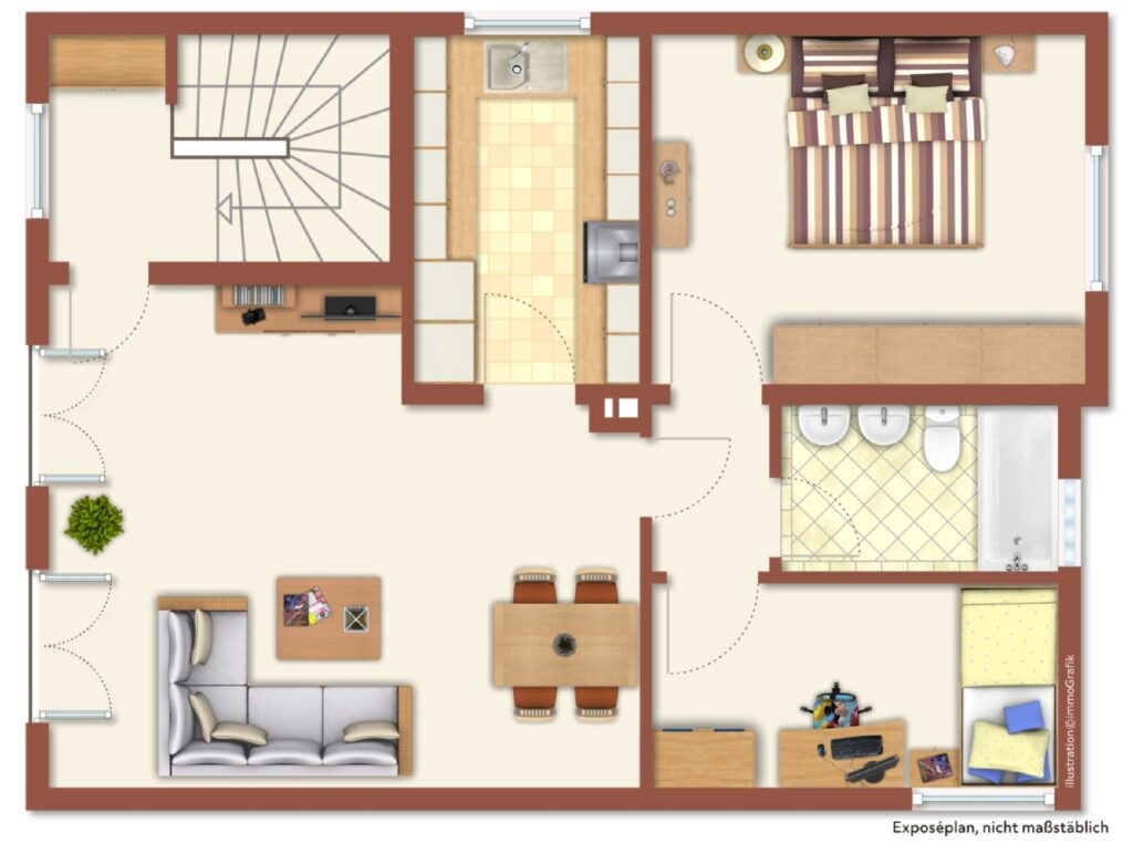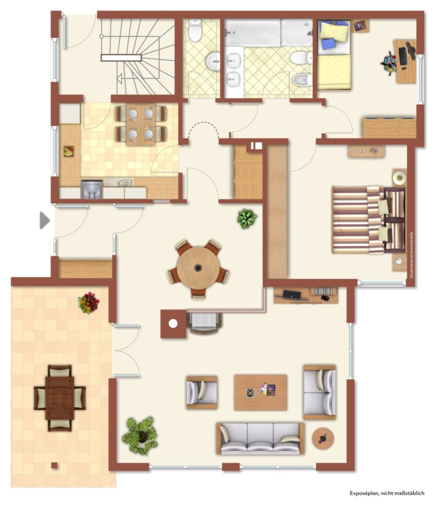 Im Erdgeschoss erwartet Sie eine großzügige Wohnküche, die zum gemeinsamen Kochen und Verweilen einlädt. Der lichtdurchflutete Essbereich geht nahtlos in das einladende Wohnzimmer über, das mit einem gemütlichen Kamin ausgestattet ist und direkten Zugang zur Terrasse bietet – perfekt für entspannte Sommerabende im Freien. Hier finden Sie auch zwei behagliche Schlafzimmer, ein innenliegendes Badezimmer sowie ein praktisches Gäste-WC.
