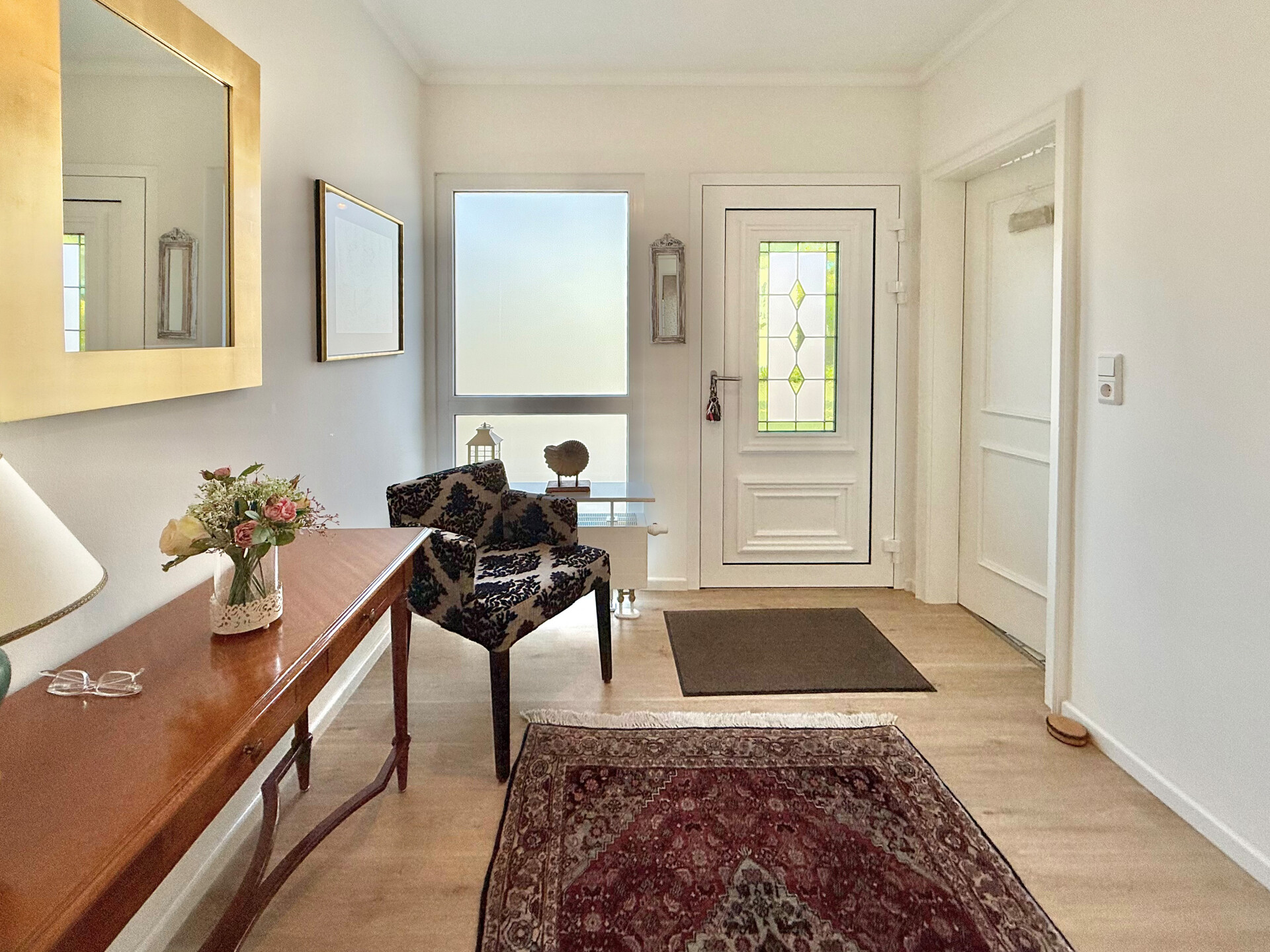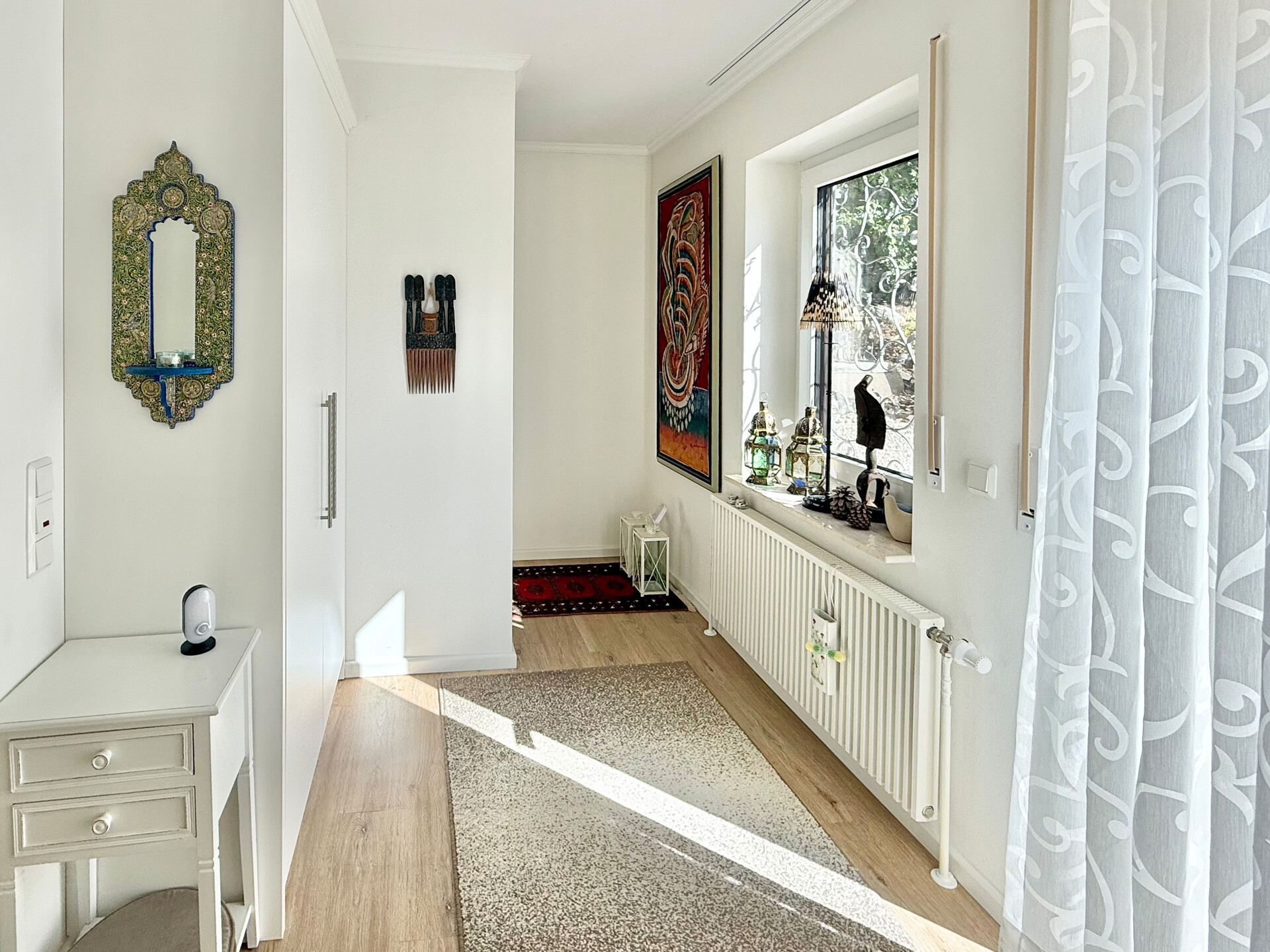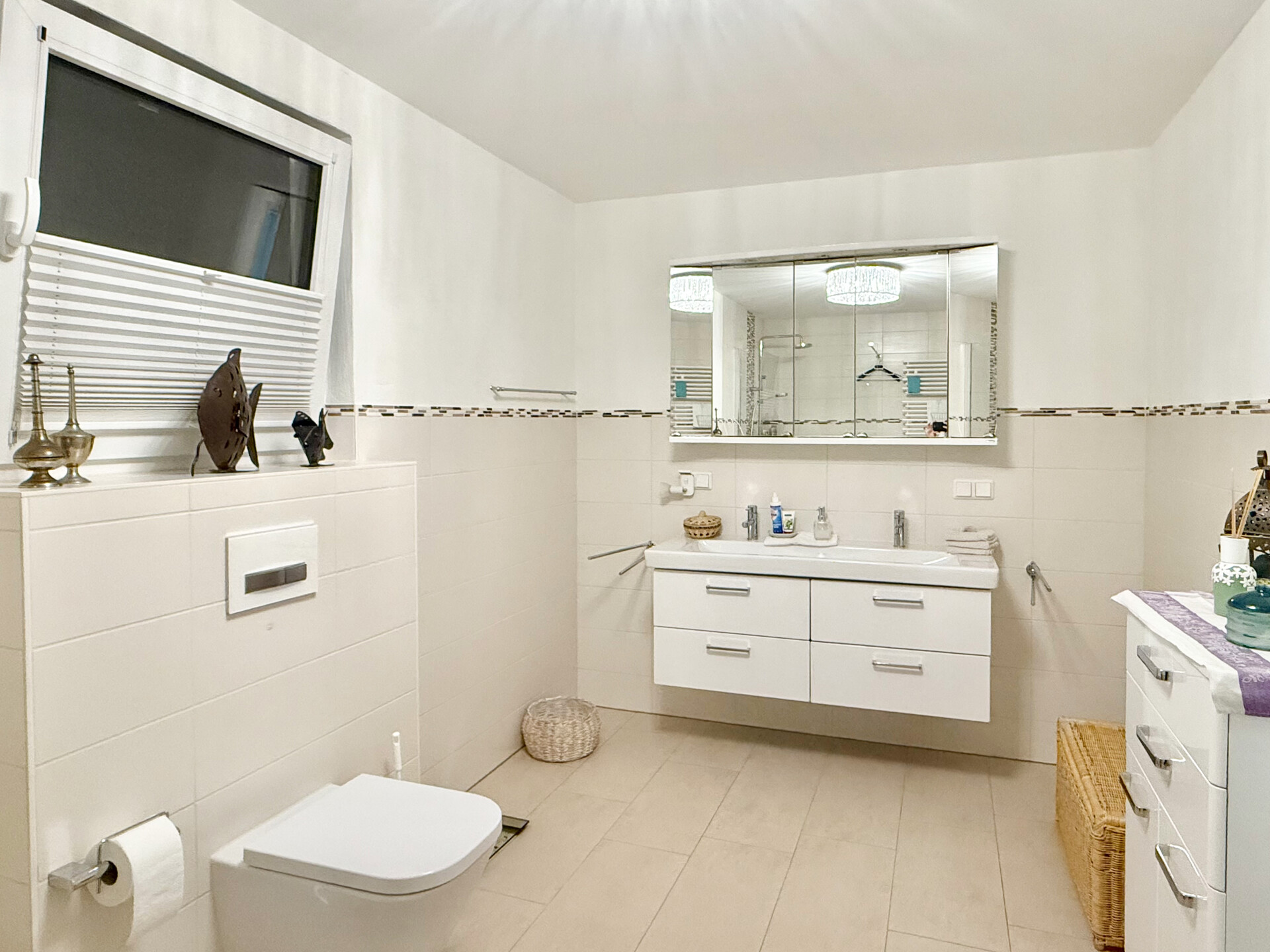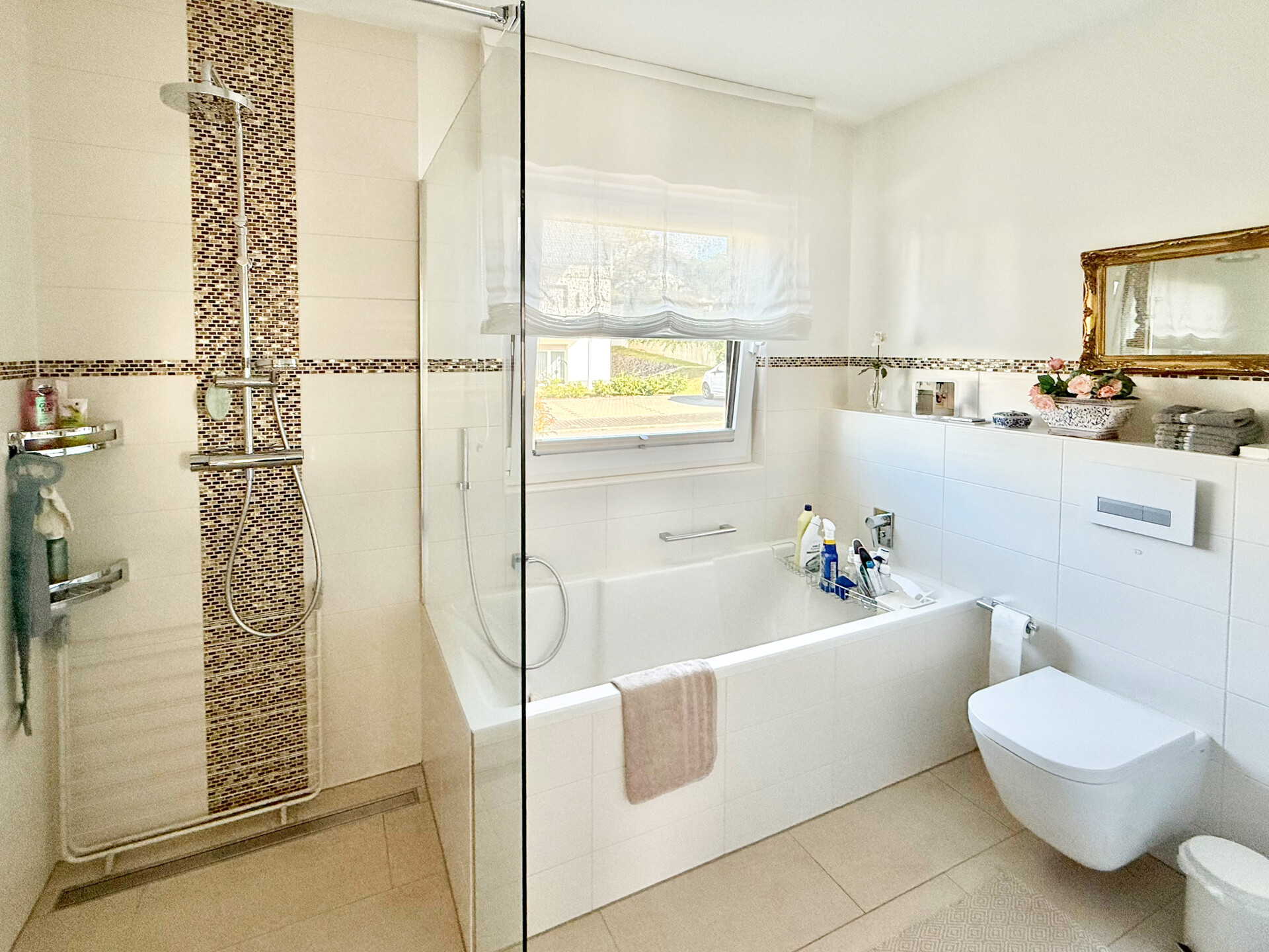 Auf rund 219 m² Wohnfläche bietet es eine gelungene Kombination aus Großzügigkeit, Komfort und durchdachter Raumaufteilung. Die helle Diele mit Garderobe und Gäste-WC führt in den offenen Wohn-/Essbereich, der mit seiner Weitläufigkeit, den bodentiefen Fenstern und dem Ausblick ins Grüne sofort überzeugt. Die Küche ist funktional geplant, mit hochwertigen Elektrogeräten ausgestattet und verfügt über einen angrenzenden Vorratsraum. Vom Wohn- und Essbereich sowie dem Schlafzimmer aus gelangen Sie direkt auf die großzügige Terrasse mit Blick über den Garten und die angrenzenden Wiesen. Ergänzt wird das Erdgeschoss durch ein weiteres Zimmer (ideal als Büro oder Kinderzimmer) sowie ein modernes Tageslichtbad mit bodentiefer Dusche, Badewanne und Fußbodenheizung. Das ausgebaute Untergeschoss ist sowohl über das Erdgeschoss als auch über einen separaten Eingang zugänglich. Es bietet einen Wohnbereich mit EBK und Terrasse, ein Schlafzimmer, ein Duschbad mit bodentiefer Dusche und Fußbodenheizung, eine Sauna mit eigener Dusche sowie einen vielseitig nutzbaren Hobbyraum – der ideale Bereich für Gäste oder Teenager.