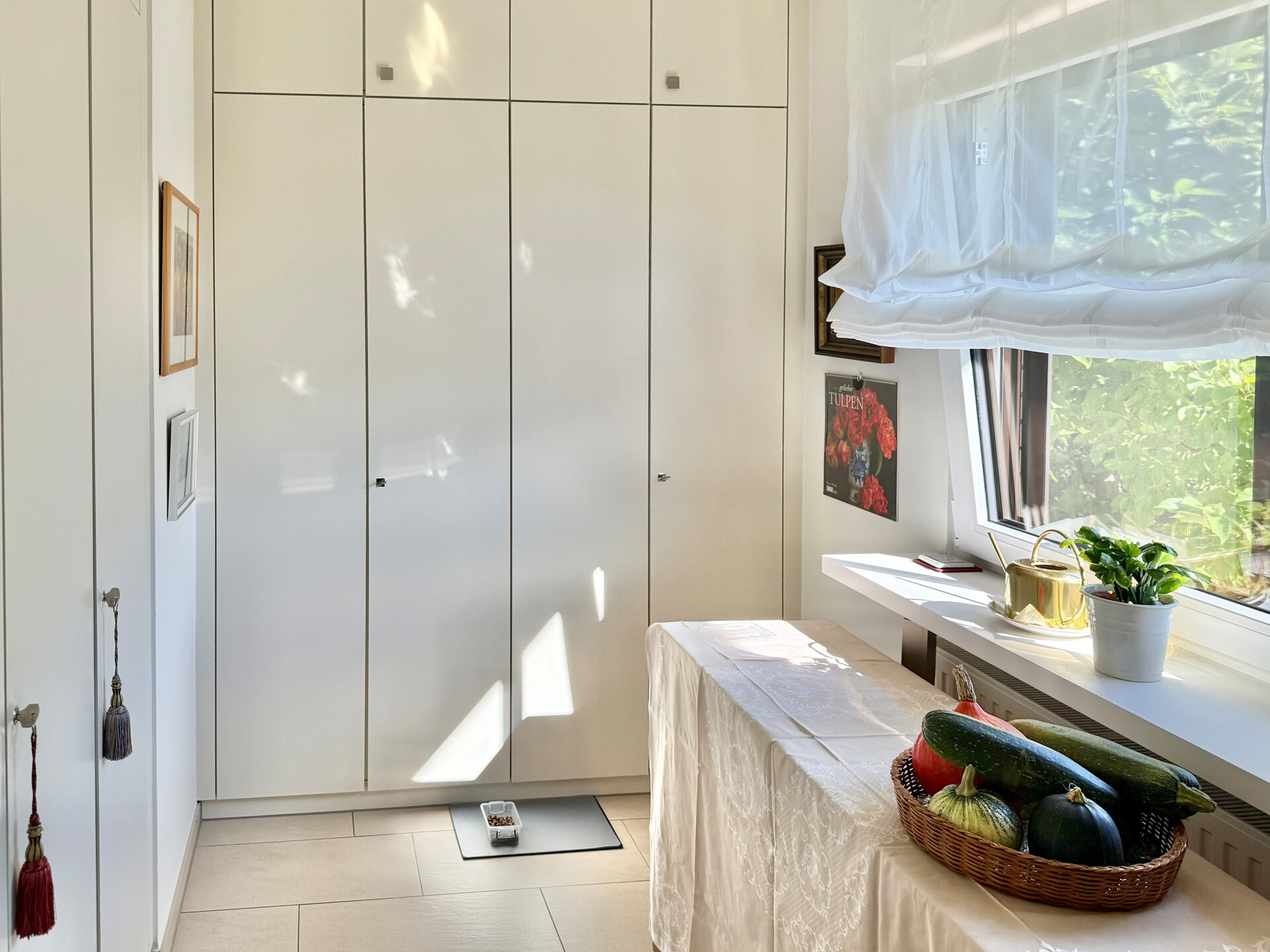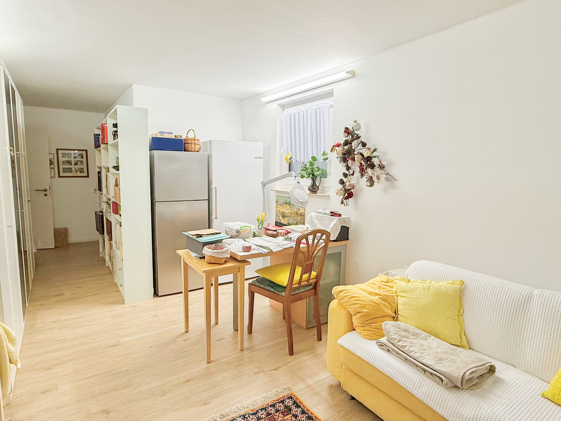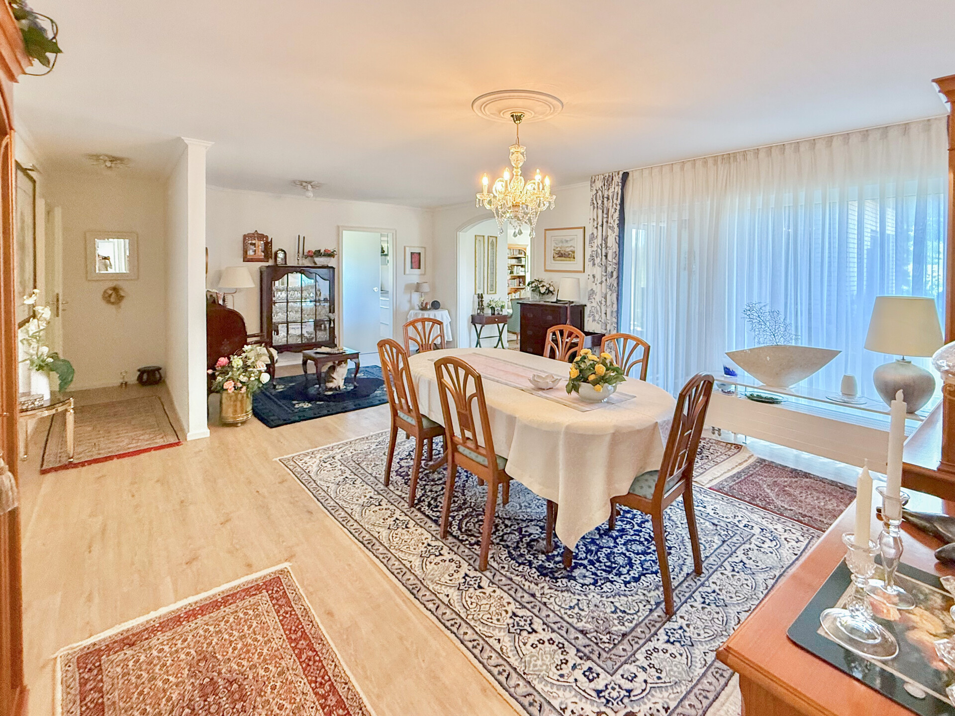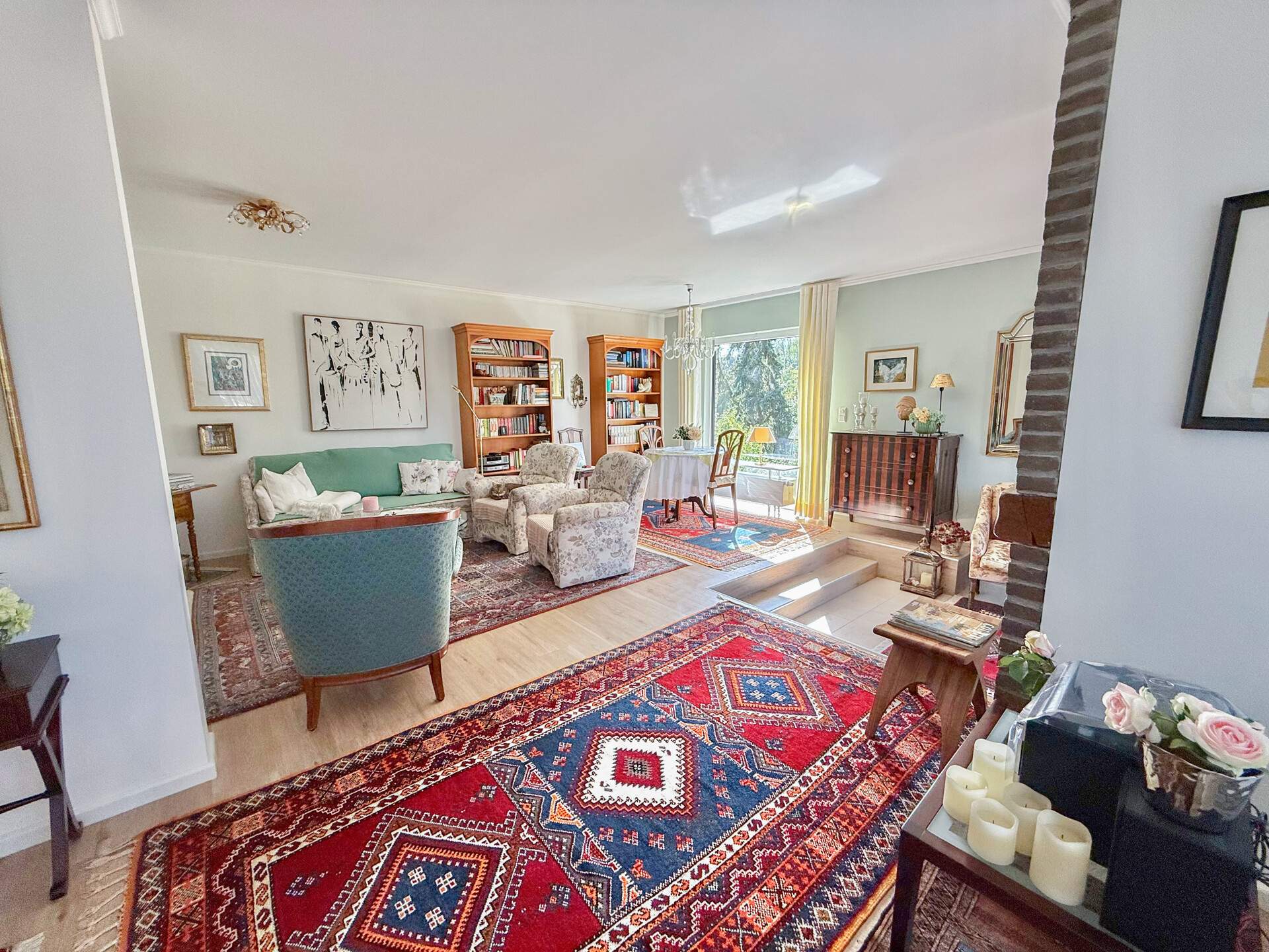 Auf rund 219 m² Wohnfläche bietet es eine gelungene Kombination aus Großzügigkeit, Komfort und durchdachter Raumaufteilung. Die helle Diele mit Garderobe und Gäste-WC führt in den offenen Wohn-/Essbereich, der mit seiner Weitläufigkeit, den bodentiefen Fenstern und dem Ausblick ins Grüne sofort überzeugt. Die Küche ist funktional geplant, mit hochwertigen Elektrogeräten ausgestattet und verfügt über einen angrenzenden Vorratsraum. Vom Wohn- und Essbereich sowie dem Schlafzimmer aus gelangen Sie direkt auf die großzügige Terrasse mit Blick über den Garten und die angrenzenden Wiesen. Ergänzt wird das Erdgeschoss durch ein weiteres Zimmer (ideal als Büro oder Kinderzimmer) sowie ein modernes Tageslichtbad mit bodentiefer Dusche, Badewanne und Fußbodenheizung. Das ausgebaute Untergeschoss ist sowohl über das Erdgeschoss als auch über einen separaten Eingang zugänglich. Es bietet einen Wohnbereich mit EBK und Terrasse, ein Schlafzimmer, ein Duschbad mit bodentiefer Dusche und Fußbodenheizung, eine Sauna mit eigener Dusche sowie einen vielseitig nutzbaren Hobbyraum – der ideale Bereich für Gäste oder Teenager.