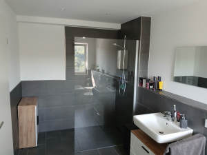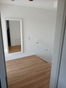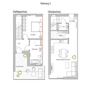Diese sehr schöne Wohnung erstreckt sich über zwei Ebenen. Die insgesamt 83,28 m² Wohnfläche sind aufgeteilt in ein großes Wohn- & Esszimmer mit offener Ku¨che, einem Gäste-WC sowie einen separaten Abstellraum, in dem man Waschmaschine und Trockner anschließen kann. Über eine Treppe gelangen Sie in das Staffelgeschoss. Hier befinden sich ein Schlafzimmer und ein großes Badezimmer mit Badewanne und bodentiefer Dusche. Über den Flur erreicht man die große und ganztägig besonnte Dachterrasse mit einer unverbaubaren Aussicht. Zu der Wohnung gehört auch eine Abstellfläche im Gemeinschaftskeller. Alle Räume verfügen über eine Fußbodenheizung, hochwertigen Vinyl- bzw. Fliesenboden.
