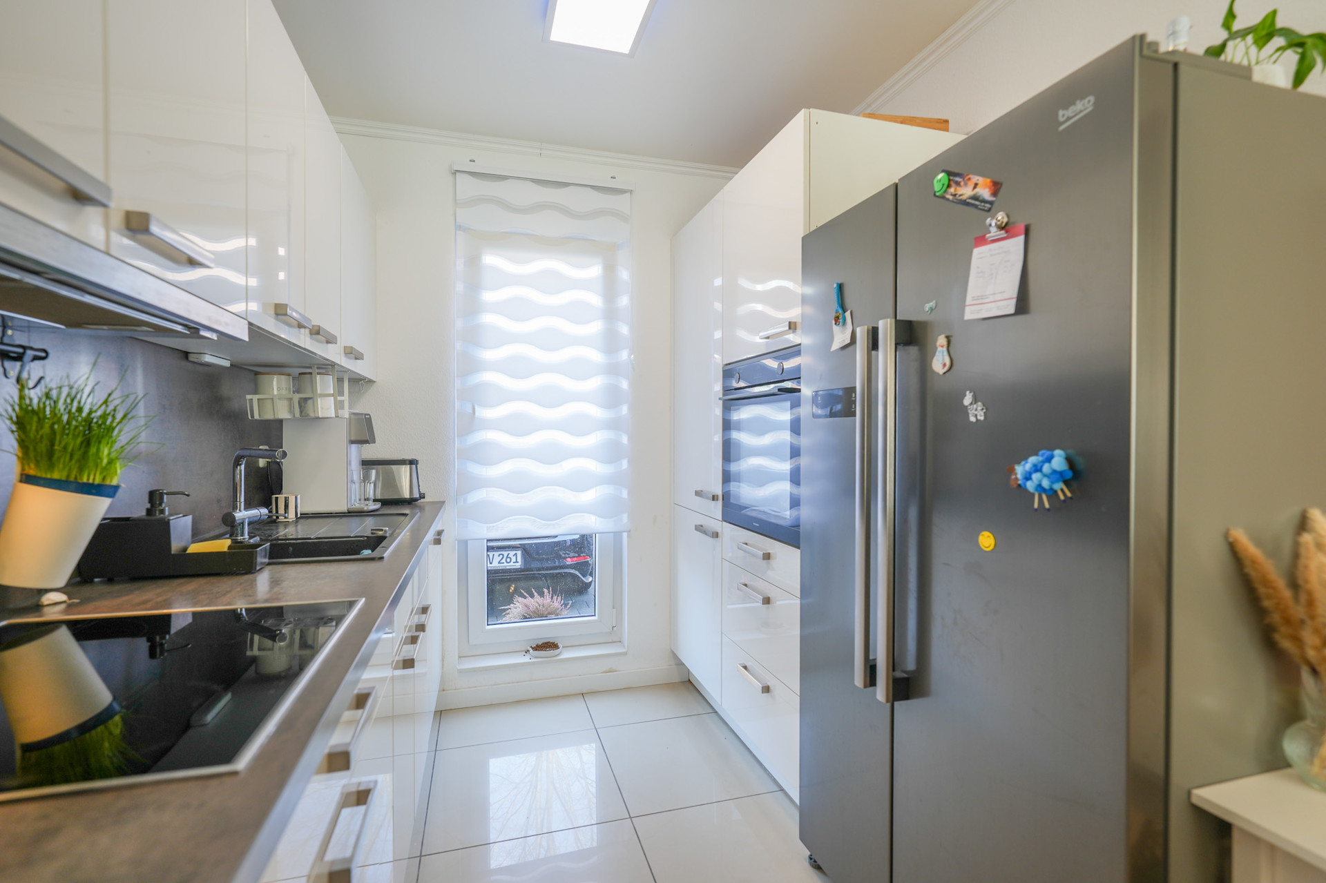praktisch gestalteter Küchenbereich, der nahtlos in den Wohn- und Essbereich übergeht und eine einladende Atmosphäre schafft