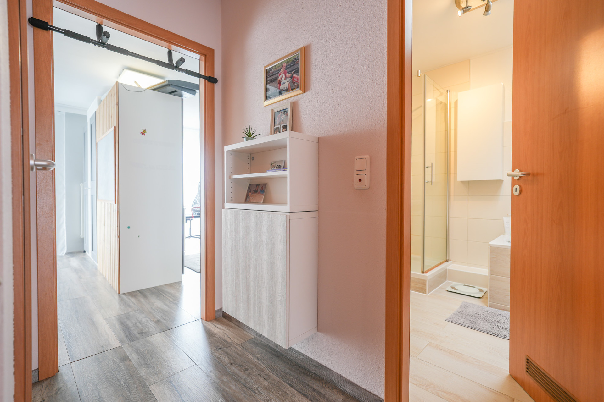 Hier befinden sich ein geräumiges Schlafzimmer, ein freundlich gestaltetes Kinderzimmer sowie das Hauptbadezimmer
