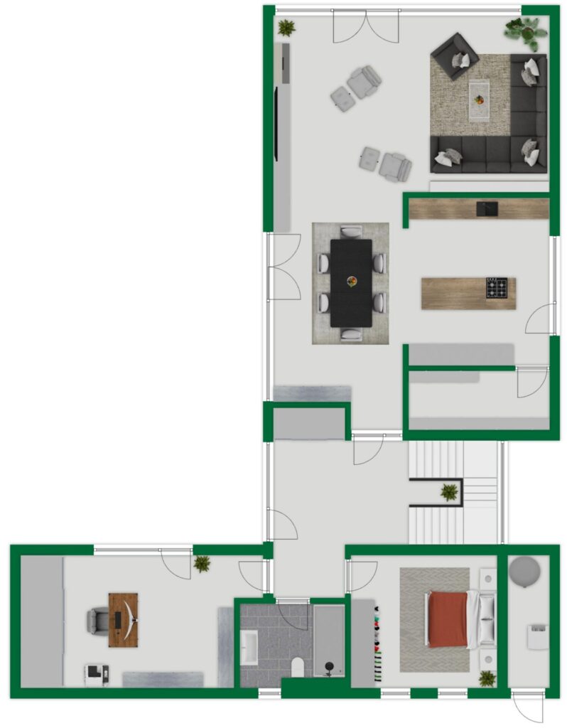 Das Haus erstreckt sich über Erd- und Obergeschoss und beeindruckt bereits beim Betreten mit seiner offenen, lichtdurchfluteten Gestaltung. Großzügige Glasflächen schaffen fließende Übergänge zwischen Innen- und Außenbereich, während hochwertige Materialien und ein fugenloser Boden ein modernes, harmonisches Gesamtbild erzeugen. Im Wohn- und Essbereich sorgt ein Kamin für behagliche Atmosphäre, während die offen gestaltete Küche mit Kochinsel, hochwertigen Einbauten und einem angrenzenden Vorratsraum überzeugt.