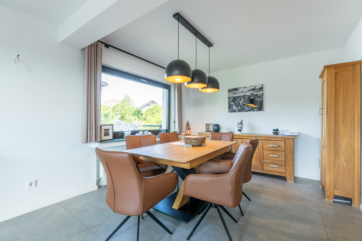 Der elegante Eingangsbereich heißt Sie herzlich Willkommen! Der Wohn-Essbereich lässt durch seine außergewöhnlich großen Fenster die Sonne hinein und bietet Ihnen einen himmlischen Blick in Ihren Traumgarten. Lange Verweilen mit der Familie lässt es sich vor dem gemütlichen Kamin. Direkt nebenan befindet sich der Küchenbereich mit Blick in den Vorgarten. Perfekt passend zum modernen Interieur erwartet Sie hier eine schöne Einbauküche, die sogar schon im Kaufpreis enthalten ist! Besonders ansprechend ist auch das individuelle Duschbad, welches durch die bodentiefe XXL-Dusche und ausgefallenes Design besticht. Für den Besuch wurde selbstverständlich auch an ein Gäste- WC gedacht. Gleich zwei großzügige Schlafzimmer mit Blick in den Garten ermöglichen das 100 %ige Wohnen auf einer Ebene. Absolutes Highlight ist außerdem der beheizbare Wintergarten, der aktuell als Büro genutzt wird. Hier hält man sich zu jeder Jahreszeit gerne auf!