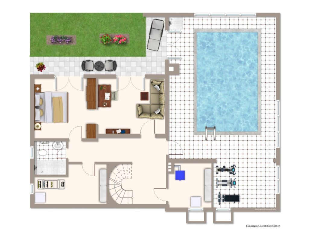 Im Untergeschoss stehen gleich zwei weitere behagliche Schlafräume mit Zugang in den Garten zur Verfügung. Ein neues Duschbad sowie ein großer Abstellraum komplettieren dieses tolle Haus. Ein herrliches Schwimmbad ermöglicht Badespaß das ganze Jahr über. Sie werden begeistert sein! Ein direkt angrenzender Bereich eignet sich hervorragend als Sport- oder Ruheraum. Auch der nachträgliche Einbau einer Sauna wäre hier denkbar.