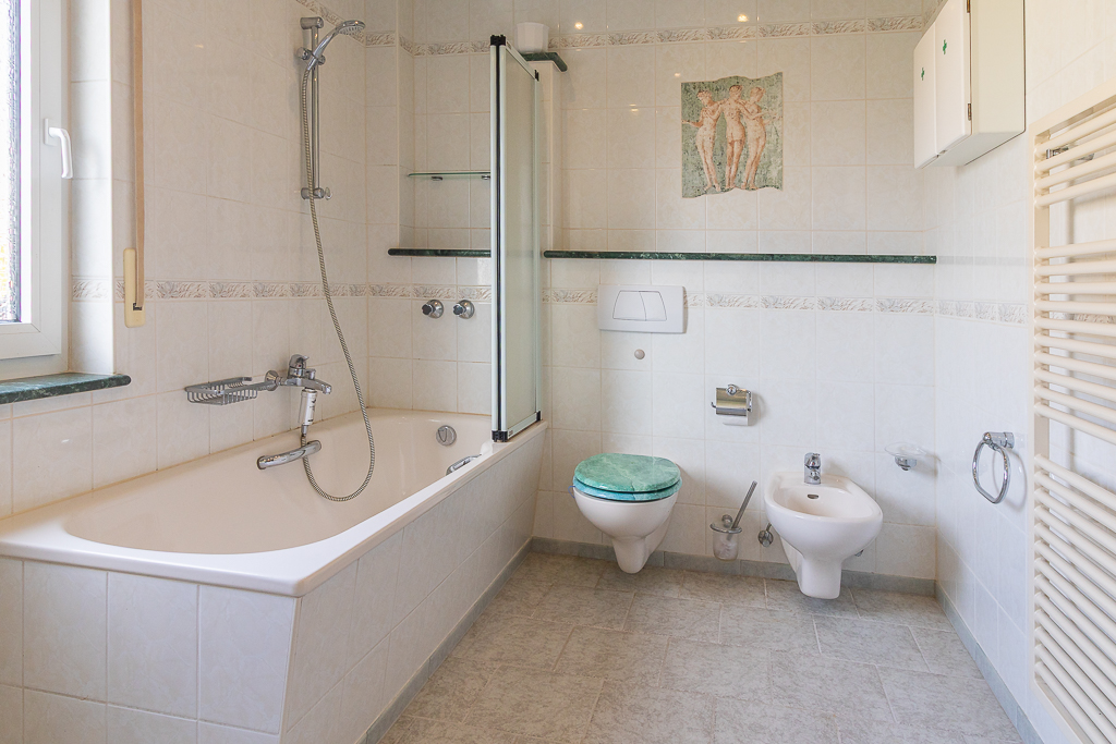 Im Erdgeschoss empfängt Sie eine geräumige Diele, von der aus sämtliche Bereiche des Hauses erreichbar sind. Hier befinden sich außerdem ein Gäste-WC, eine große Küche sowie das über die gesamte Hausbreite angelegte Wohnzimmer. Durch die großzügige 3-fach verglaste Fenstertürschiebe-Anlage (Baujahr 2016) gelangen Sie direkt auf die sonnige Südterrasse und in den schön grün angelegten Garten, der über eine Treppe zugänglich ist und zum Entspannen einlädt.