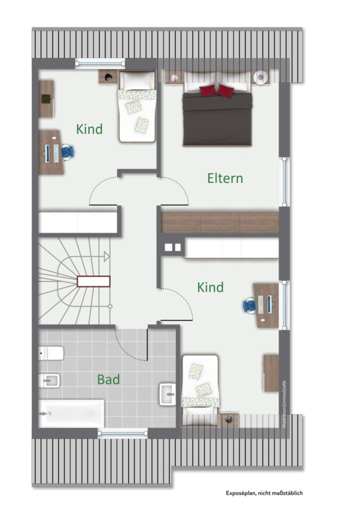 Eine offene, halb gewendelte Treppe mit eleganten Stufen in Edelholz verbindet alle Etagen miteinander. Im 1. Obergeschoss stehen Ihnen drei Schlafzimmer sowie ein großzügiges Tageslichtbad zur Verfügung. Das Dachgeschoss bietet ein zusätzliches Studio mit praktischer Abstellkammer und schafft damit weitere flexible Nutzungsmöglichkeiten.