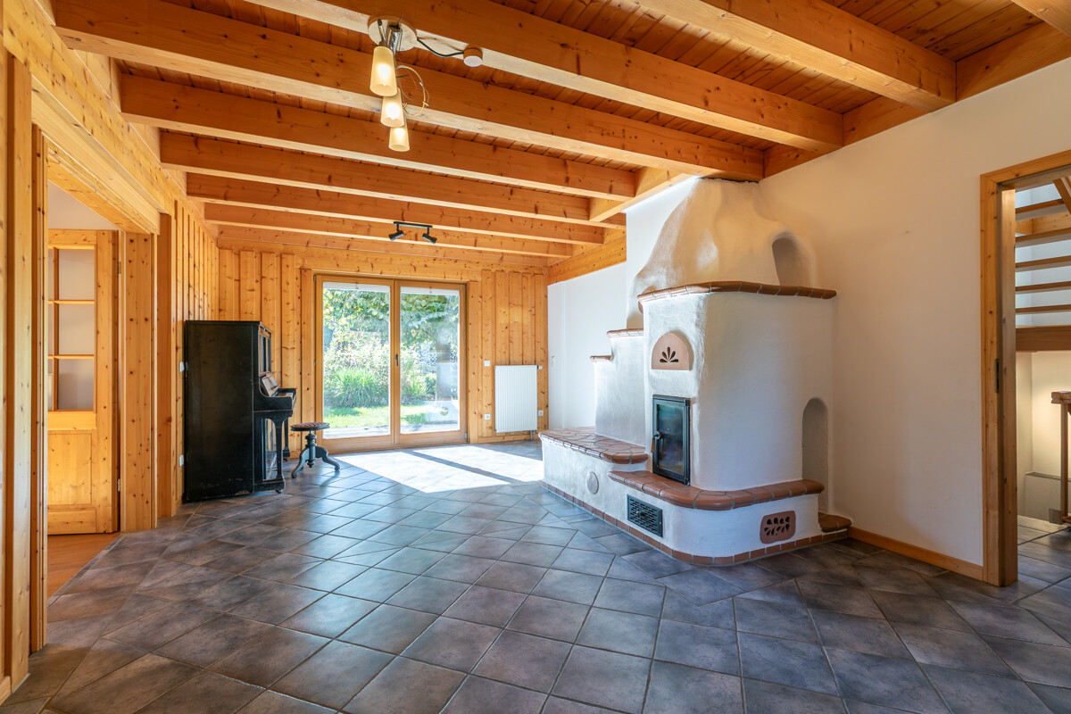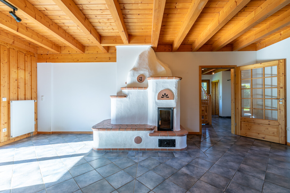 Von den hervorragend dämmenden Holzwänden dieses Stommel-Hauses und der klimatisierenden Wirkung, die gefühlte Temperatur 2 – 3 Grad angenehmer als die gemessene erscheinen zu lassen, profitieren die Bewohner das ganze Jahr über. Und im Winter muss die Heizung nur sparsam zum Einsatz kommen, da hier ein Kaminofen für Wärme und Behaglichkeit sorgt.