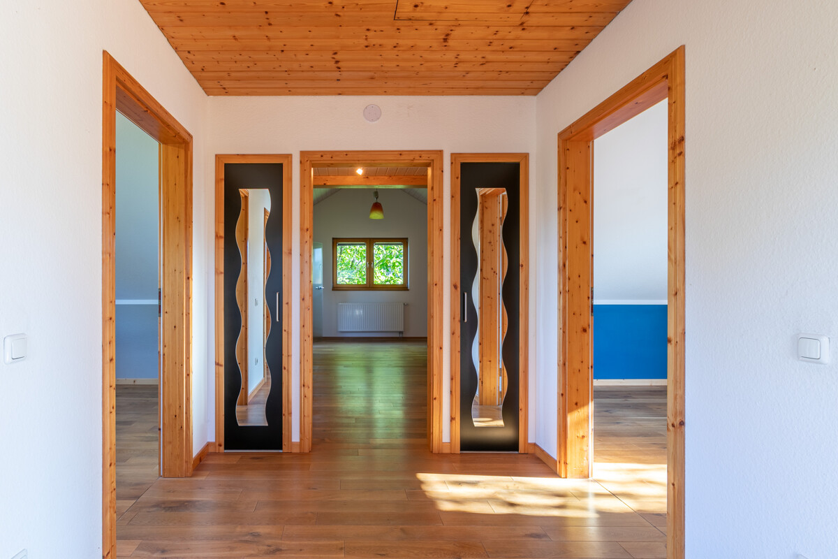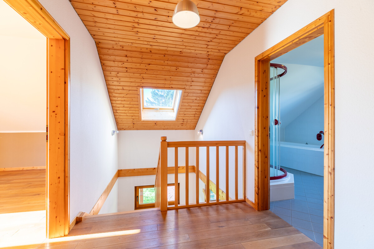 Über eine schöne Holztreppe gelangt man in das DG des Hauses. Hier warten gleich vier Schlafzimmer auf Sie! Für die vorderen drei, die als Kinderzimmer gedacht sind, wurde ein eigenes Vollbad geplant. Außerdem profitieren zwei der Zimmer von einem großzügigen Balkon, der sich über die komplette Giebelseite erstreckt. Das Elternschlafzimmer liegt im hinteren Bereich des DG und verfügt über ein Ensuite-Bad. Ein wunderbares Refugium!