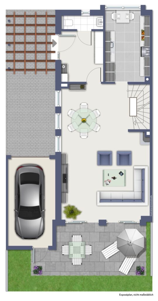 Der großzügige Eingangsbereich empfängt Sie freundlich und führt in den Wohn- und Essbereich mit Blick in den sonnigen Südgarten. Durch die großen Fensterfronten fällt reichlich Tageslicht ein und sorgt für eine helle, einladende Atmosphäre.