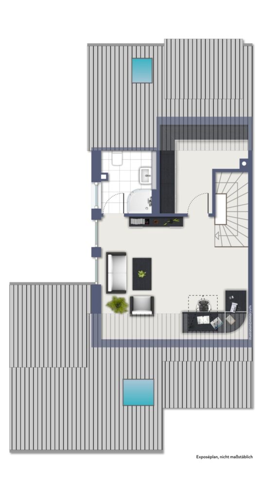 Das Studio im Dachgeschoss bietet vielfältige Nutzungsmöglichkeiten – ob als Elternsuite, Büro oder Gästezimmer – und verfügt über ein weiteres Bad.