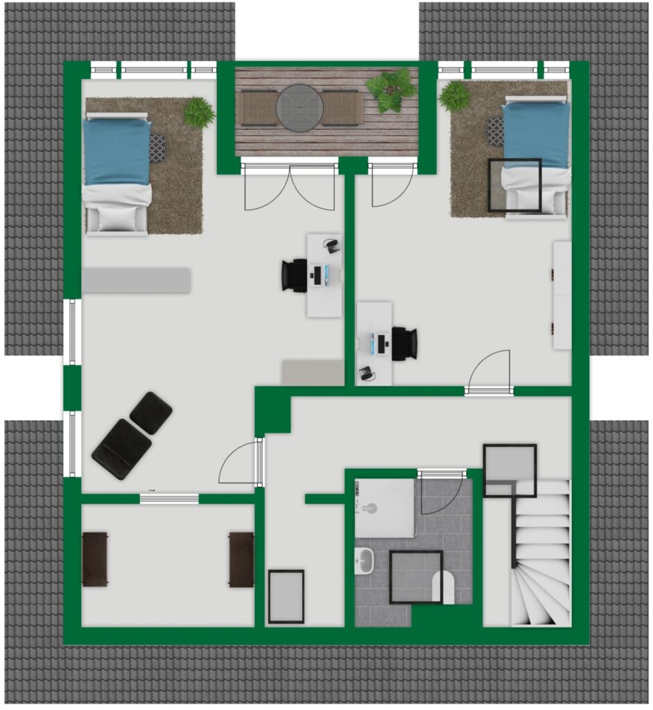 Im Obergeschoss stehen Ihnen zwei Schlafzimmer und ein Balkon mit herrlicher Fernsicht zur Verfügung. Ein stilvolles Badezimmer mit Doppelwaschbecken, Wanne und Dusche mit flachem Einstieg sowie ein separates WC vervollständigen das Raumangebot auf dieser Etage.
