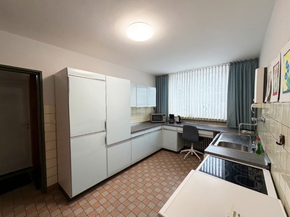 Neben dem Wohn- und Essbereich befindet sich die großzügig geschnittene Küche, die funktional angeordnet ist und kurze Wege bietet. Von hier aus gelangen Sie in den Keller sowie über einen seitlichen weiteren Hauseingang direkt zur Garage.