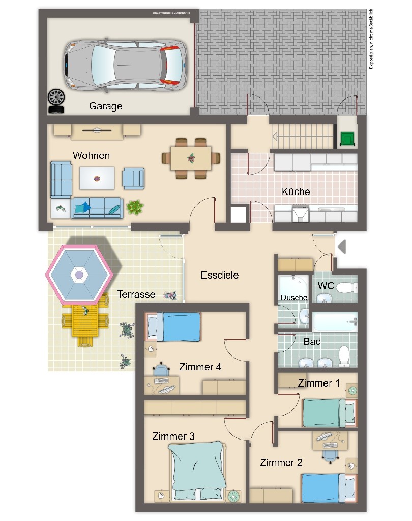 Die Garage, die sich direkt am Haus befindet, bietet Platz für Ihren PKW und ist besonders praktisch für Familien mit Kinderwagen oder Fahrrädern. Die direkte Anbindung der Garage an das Haus garantiert kurze Wege, vor allem bei schlechtem Wetter.