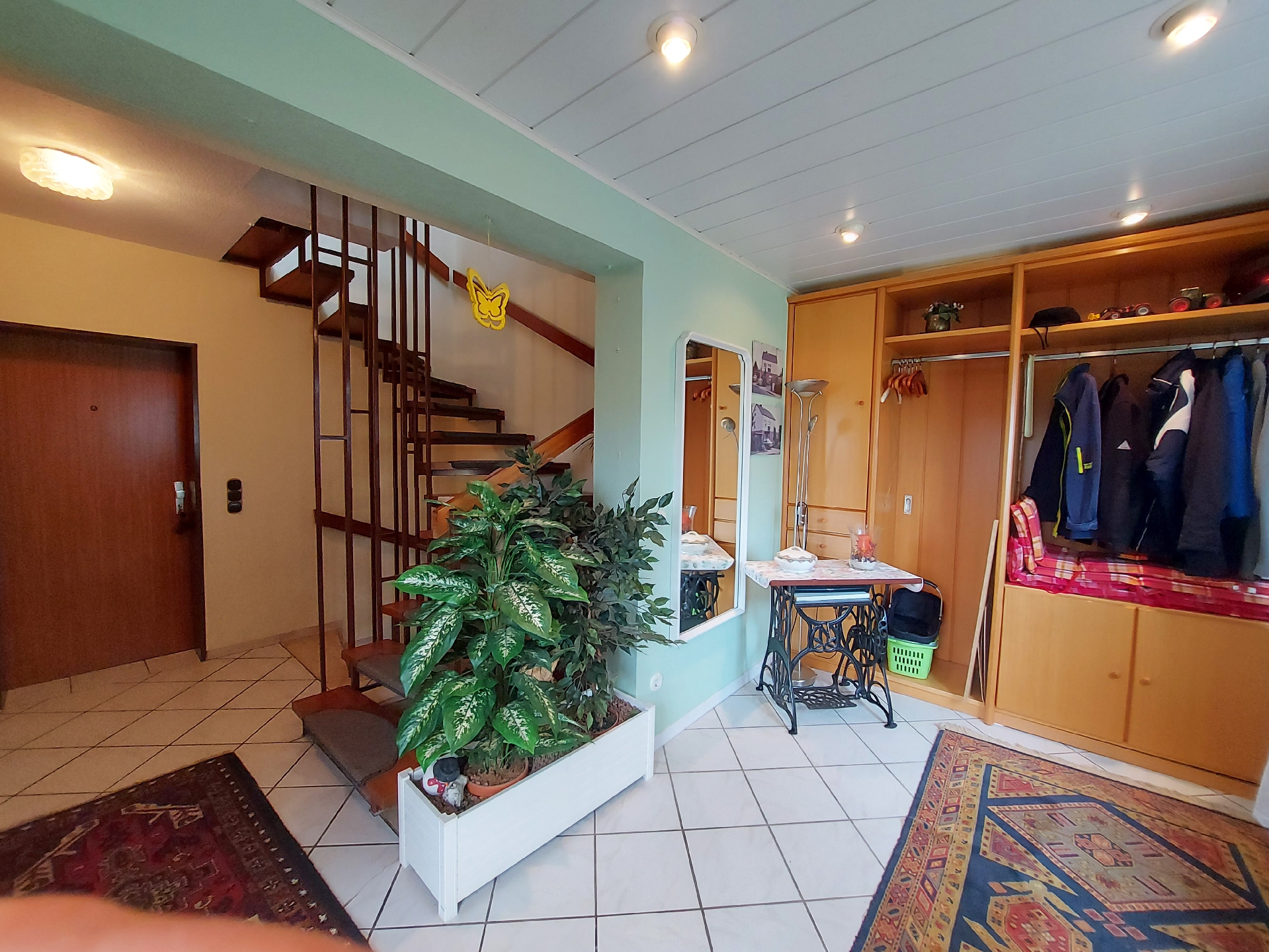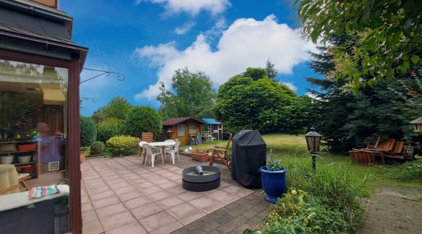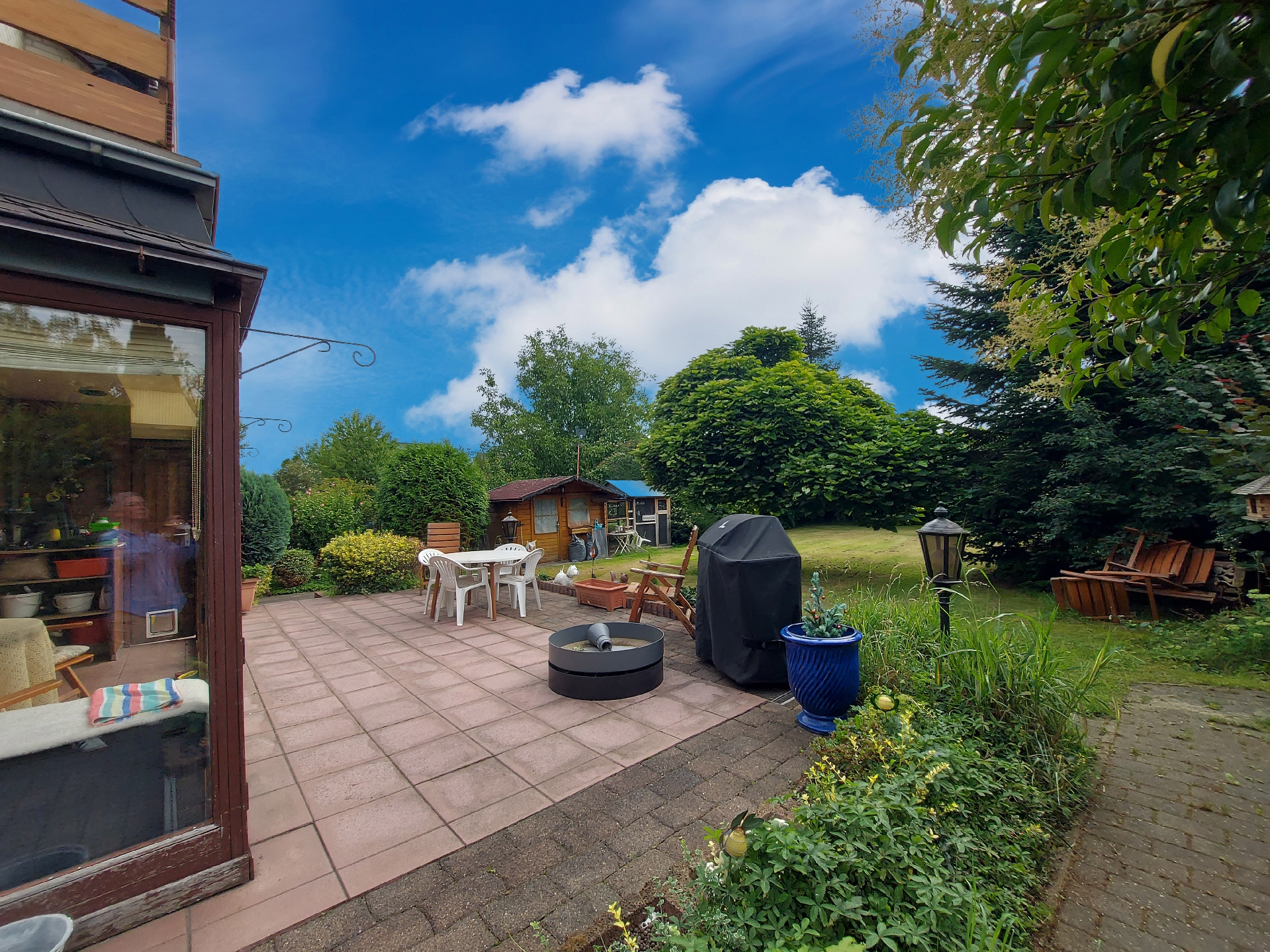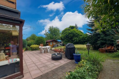 Der große Garten bietet zahlreiche Gestaltungsmöglichkeiten ob für Spiel und Freizeit, Gemüseanbau oder entspannte Stunden im Grünen. Die Terrasse lädt zum Verweilen ein, während der praktische Windfang für zusätzlichen Komfort und Wetterschutz sorgt.