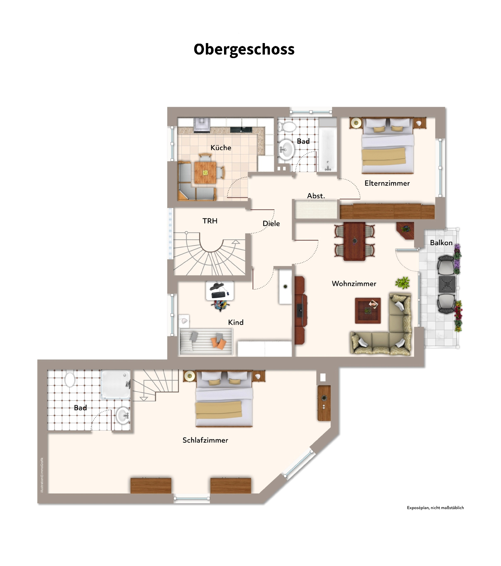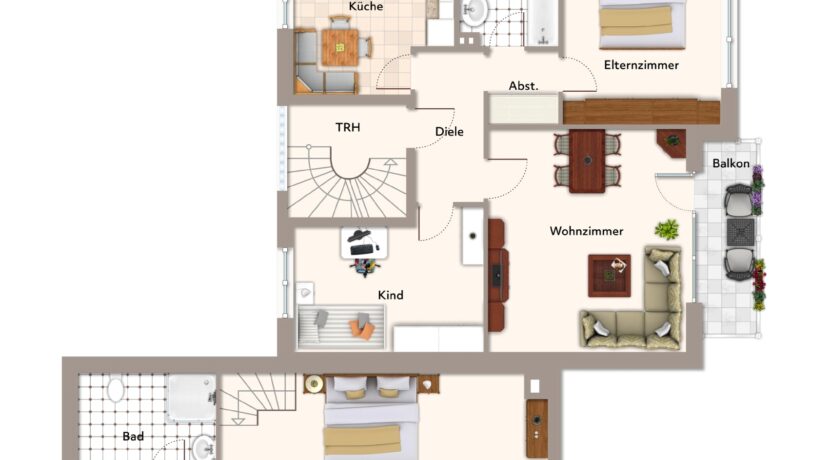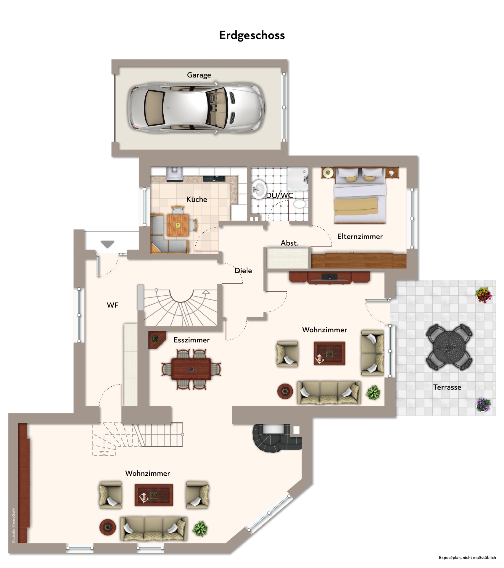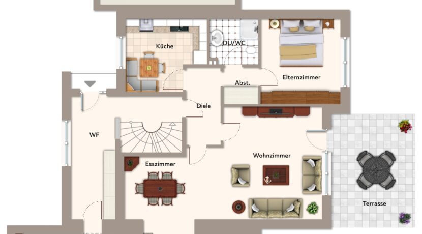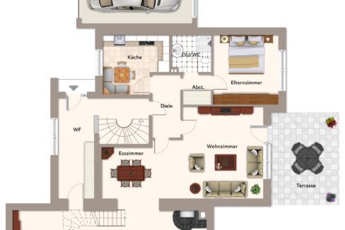 Das Erdgeschoss bietet ca. 106 m² Wohnfläche mit einem durchdachten Grundriss, großzügigen Wohnbereichen und direktem Zugang zur Terrasse und zum Garten.