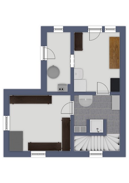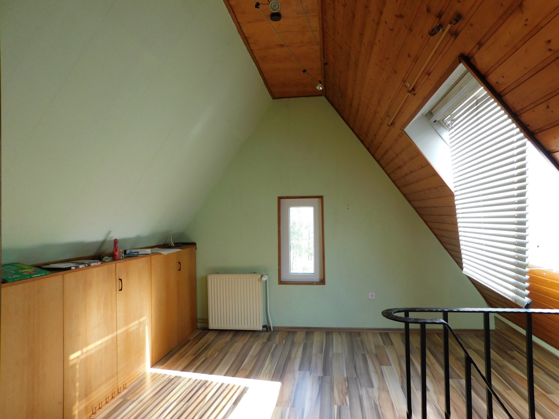 Im Obergeschoss befindet sich das Bad mit einer Badewanne und zwei Waschbecken sowie ein sehr großer Schlaf-/Wohnraum.