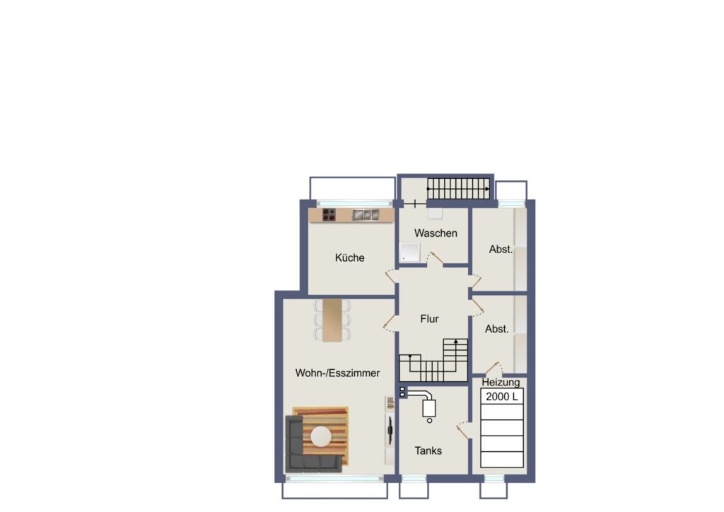 Das Erdgeschoss bietet Ihnen einen großzügigen Flur, ein großes Wannenbad sowie ein kleineres Duschbad und aktuell eine eher kleine Küche, welche Sie jedoch durch einen Durchbruch zum Ess- und Wohnzimmer deutlich vergrößern können, wenn gewünscht.