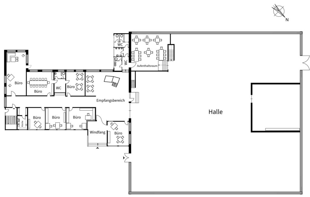 – Möglichkeit, einen Teil der Fläche im Obergeschoss mit ca. 150 m² als Wohnfläche zu nutzen