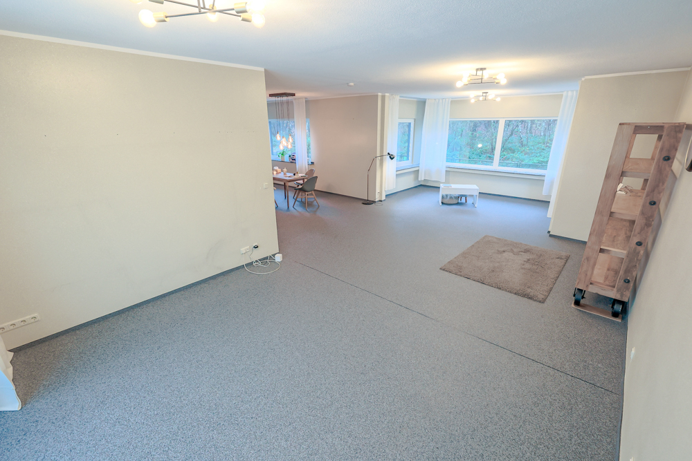 Durch die Hanglage ist das Gebäude in ein Gartengeschoss, ein Erdgeschoss auf Straßenniveau sowie ein Obergeschoss gegliedert. Das Gartengeschoss öffnet sich ebenerdig zum Garten und bietet einen großen Raum, der sich ideal als Büro, Hobbyraum oder Gästezimmer eignet. Ergänzt wird diese Ebene durch ein WC, eine Dusche und eine Kochnische. Ein weiterer Raum entstand durch die Umnutzung einer ehemaligen Garage und wurde mit einer großzügigen Fensterfront und Tür ausgestattet. Zusätzlich befinden sich auf dieser Ebene zwei Garagen, ein Heizungskeller, eine Waschküche, zwei Abstellräume sowie ein Flur mit Treppe ins Erdgeschoss.