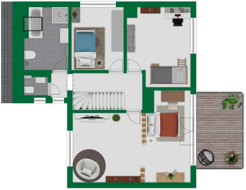 Das Obergeschoss bietet drei Schlafzimmer, von denen eines ursprünglich aus zwei Räumen bestand und bei Bedarf problemlos wieder geteilt werden kann, da der zweite Zugang vom Flur noch vorhanden ist. Ein Schlafzimmer verfügt über einen Balkon zur Wald-Seite. Durch die Fenster zur Gartenseite genießt man einen weiten Blick – bei guter Sicht ist sogar der Kölner Dom zu erkennen. Darüber hinaus befinden sich auf dieser Ebene ein Badezimmer mit Dusche und Badewanne sowie ein separates WC. Die Dachspitze ist gedämmt, die Dacheindeckung und Dämmung wurden im Jahr 2017 erneuert.