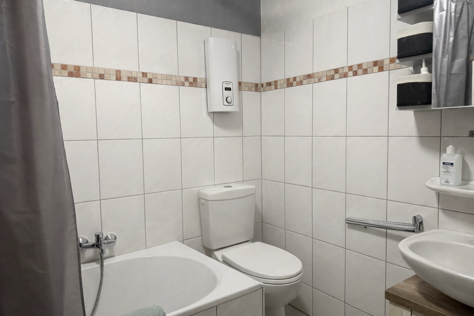 Das Badezimmer ist mit Wanne, Waschtisch und WC ausgestattet. Zusätzlich steht ein Gäste-WC mit Waschtisch und WC sowie Platz für Waschmaschine und Trockner zur Verfügung. Die Warmwasserversorgung erfolgt dezentral.