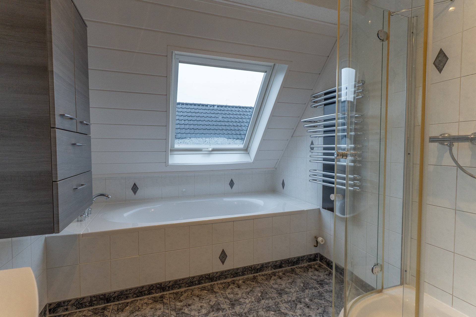 Badezimmer: Tageslichtbad mit Badewanne, Dusche, beheiztem Handtuchhalter und modernen Badezimmermöbeln