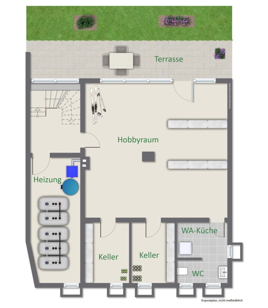 Das Haus ist voll unterkellert und beinhaltet den geräumigen Heizkeller mit der 1999 erneuerten Ölzentralheizung mit separater Warmwasserbereitung und fünf 1.000 Liter Metallöltanks, 4 weiteren Kellerräume, von denen einer über 60 qm groß ist. Aufgrund der leichten Hanglage gelangt man von hier in den Garten und zur zweiten Terrasse. Außerdem bietet die große Fensterfläche viel Licht im Keller. Aufgrund der Höhe von ca. 2,50 m kann dieser Bereich gut als Hobbyraum genutzt werden. Das sonnige Grundstück lädt zu gärtnerischen Aktivitäten und entspannten Stunden im Freien ein; ein Paradies für Naturliebhaber und Familien mit Kindern.