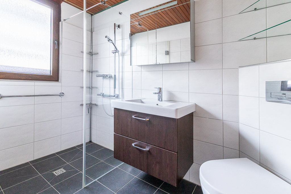 Dieses großzügige Einfamilienhaus bietet viel Freiraum und Entfaltungsmöglichkeiten für eine große Familie. Über drei Schieferstufen wird der geschützte Eingangsbereich des Hauses erreicht. Von hier aus betritt man die großzügige Eingangsdiele mit Garderobe und einem hellen, modernen und barrierefreien Duschbad. Das Herzstück des Hauses bildet das über 50m² große Wohnzimmer mit Panoramafenster und seitlichen Ausgang über eine Fenstertüre zu einer geschützten Terrasse. Der perfekte Ort für gemeinsame Stunden und entspannte Abende. Vom Wohnzimmer aus gelangt man über eine Stufe ins offene Esszimmer mit Verbindung zur Wohnküche, die auch von der Diele aus erreichbar ist.