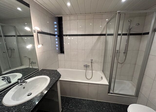 Das modern gestaltete Badezimmer ist sowohl mit einer Badewanne als auch einer Dusche ausgestattet und begeistert ebenso wie das separate Gäste-WC mit hochwertigen Materialien und edlen Granitelementen. Hier zeigt sich Liebe zum Detail in jeder Ecke.